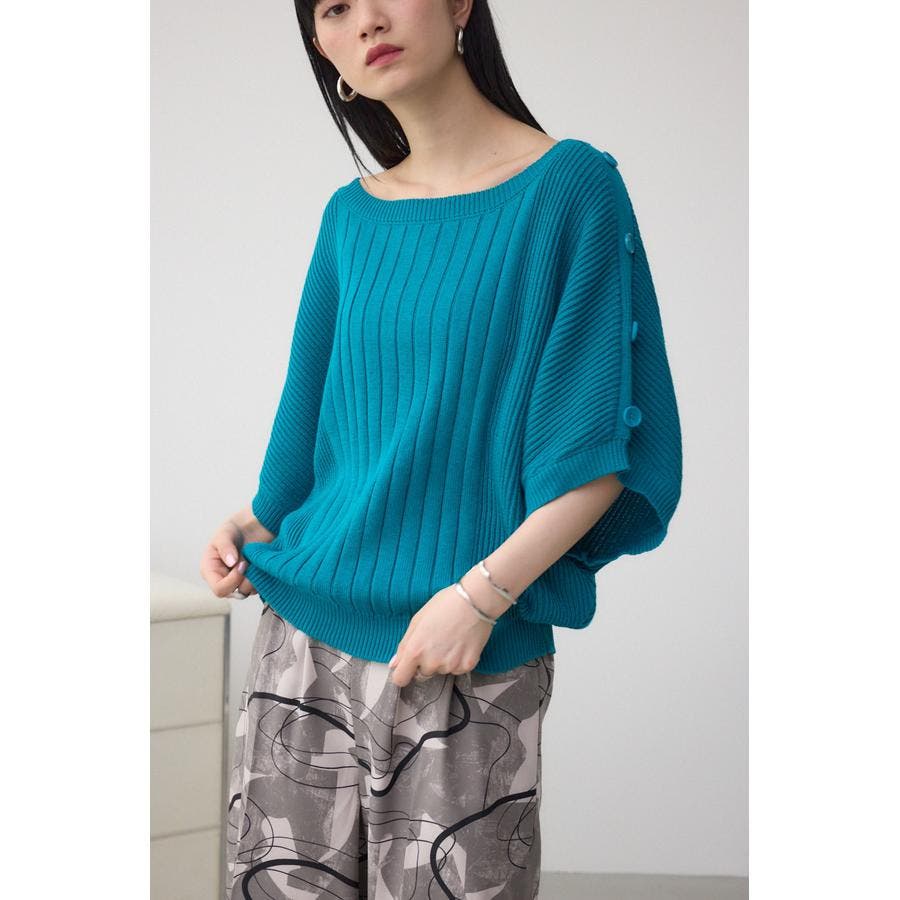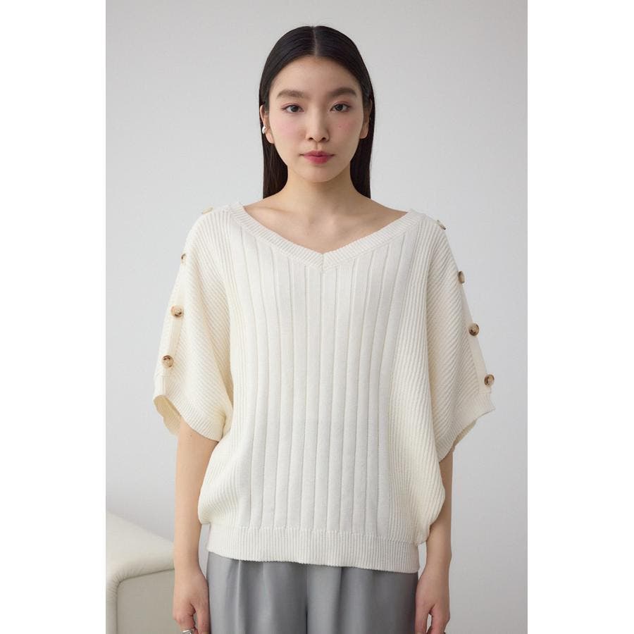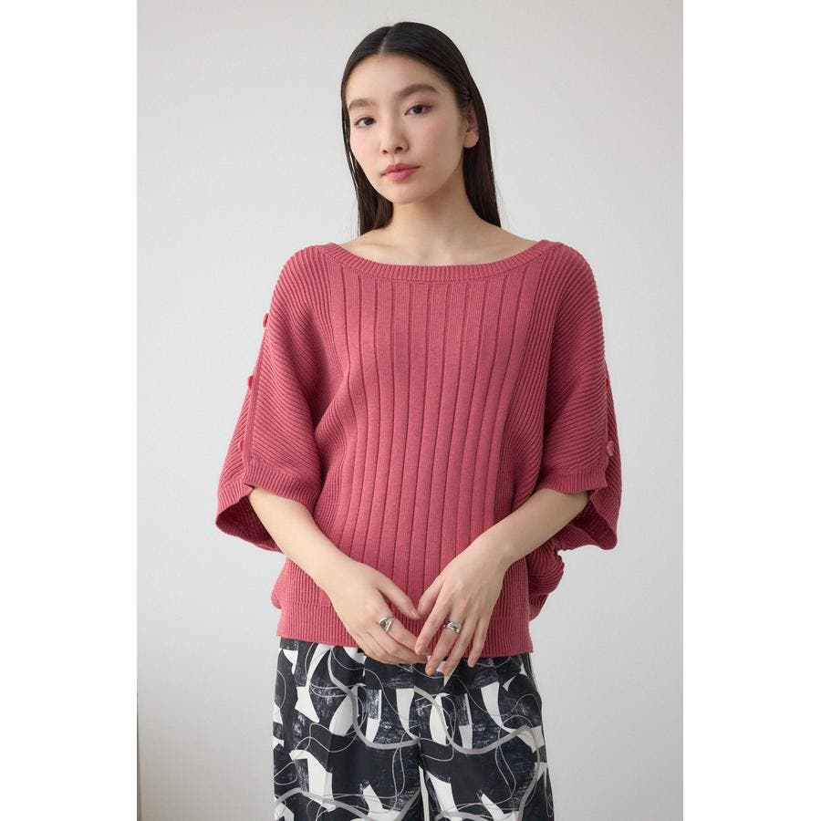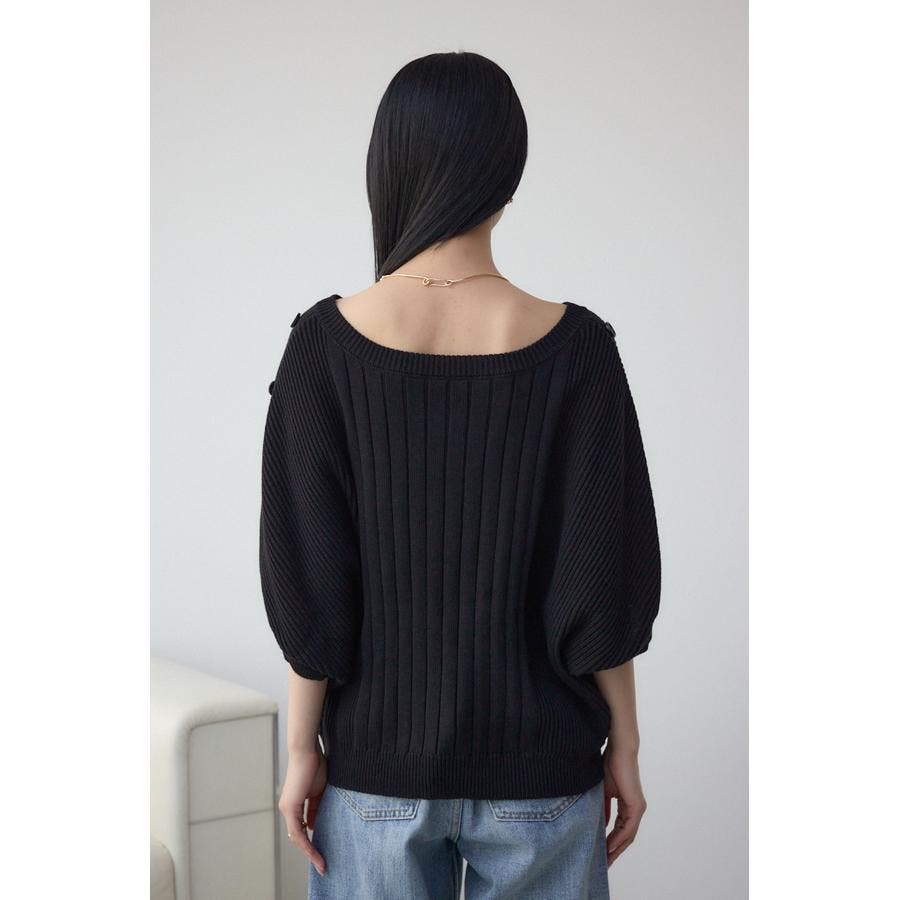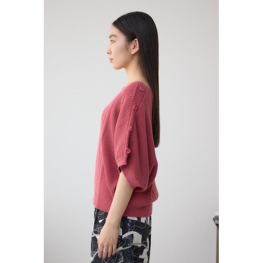 肩のボタンデザインが目を惹くデザインニット。