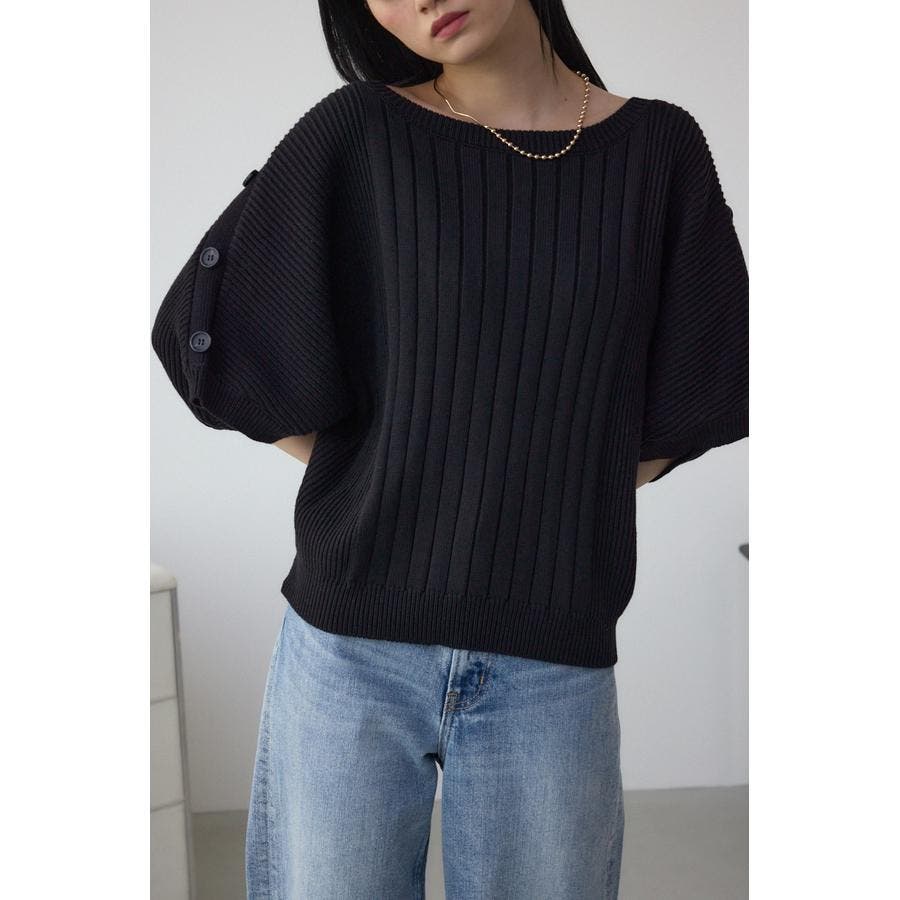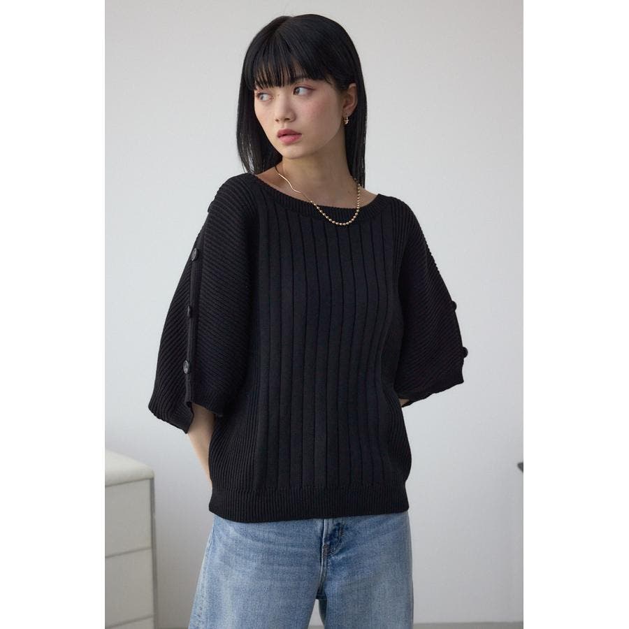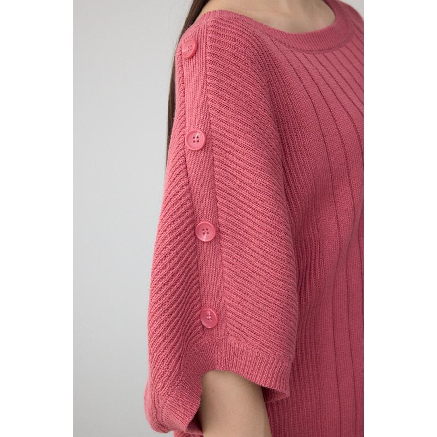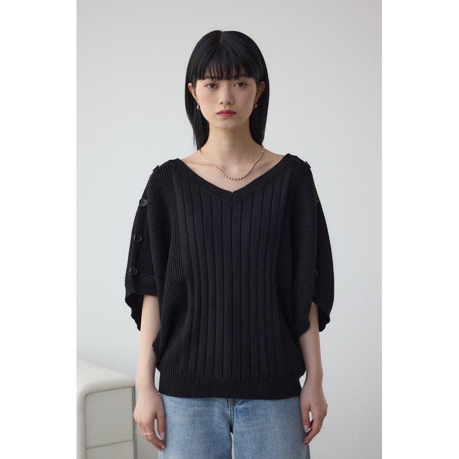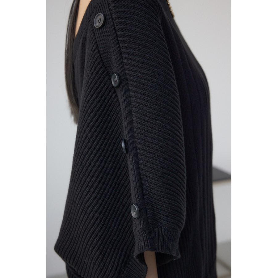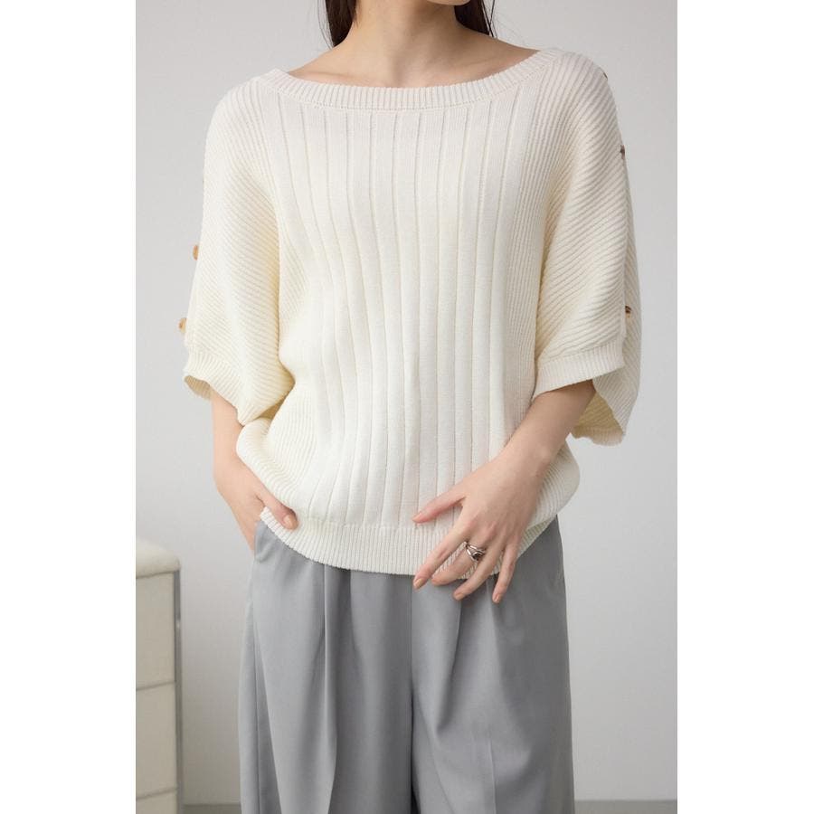 肩のボタンデザインが目を惹くデザインニット。