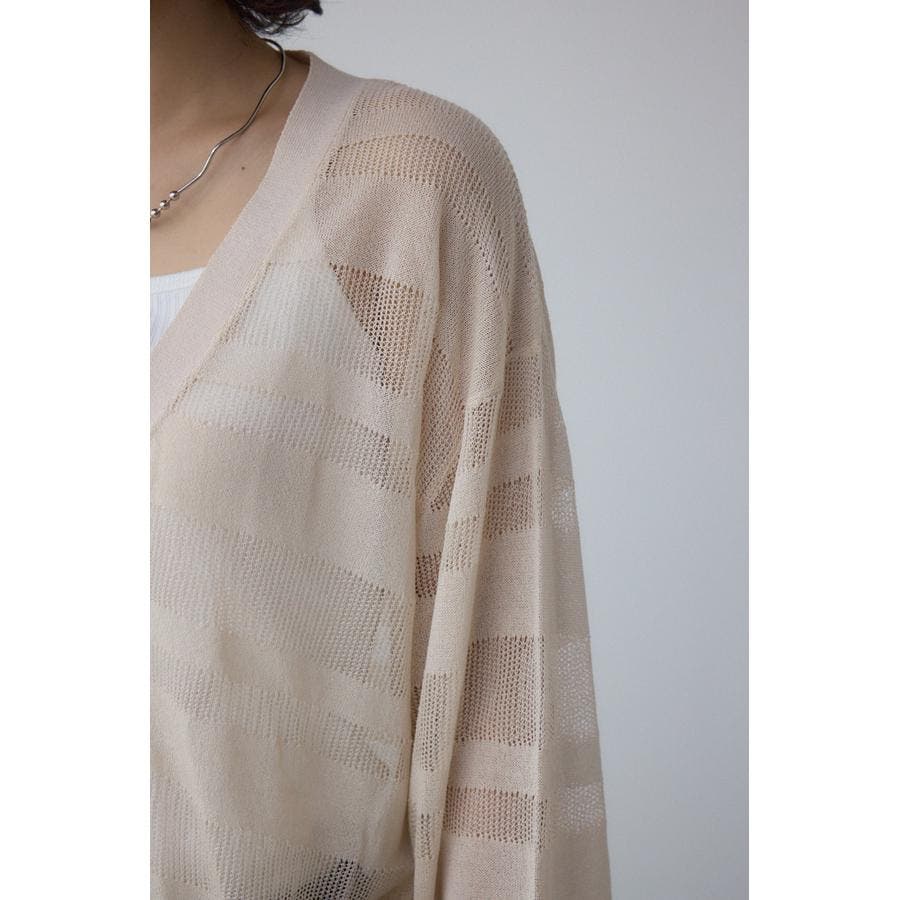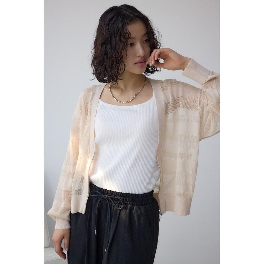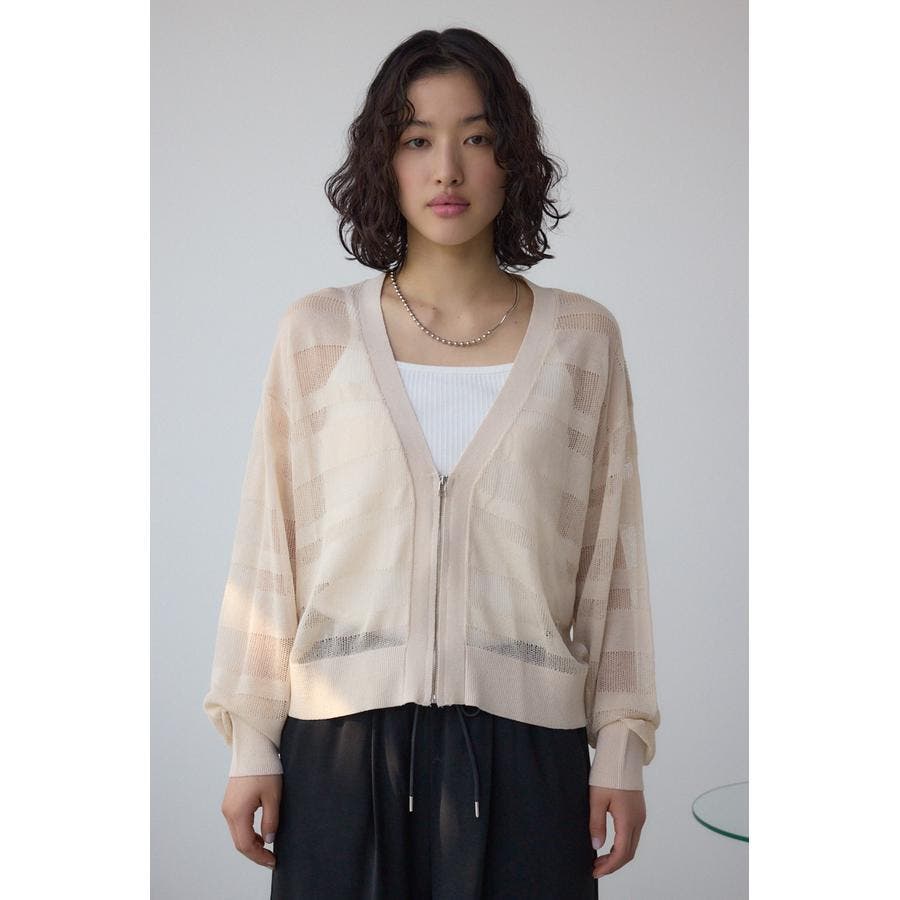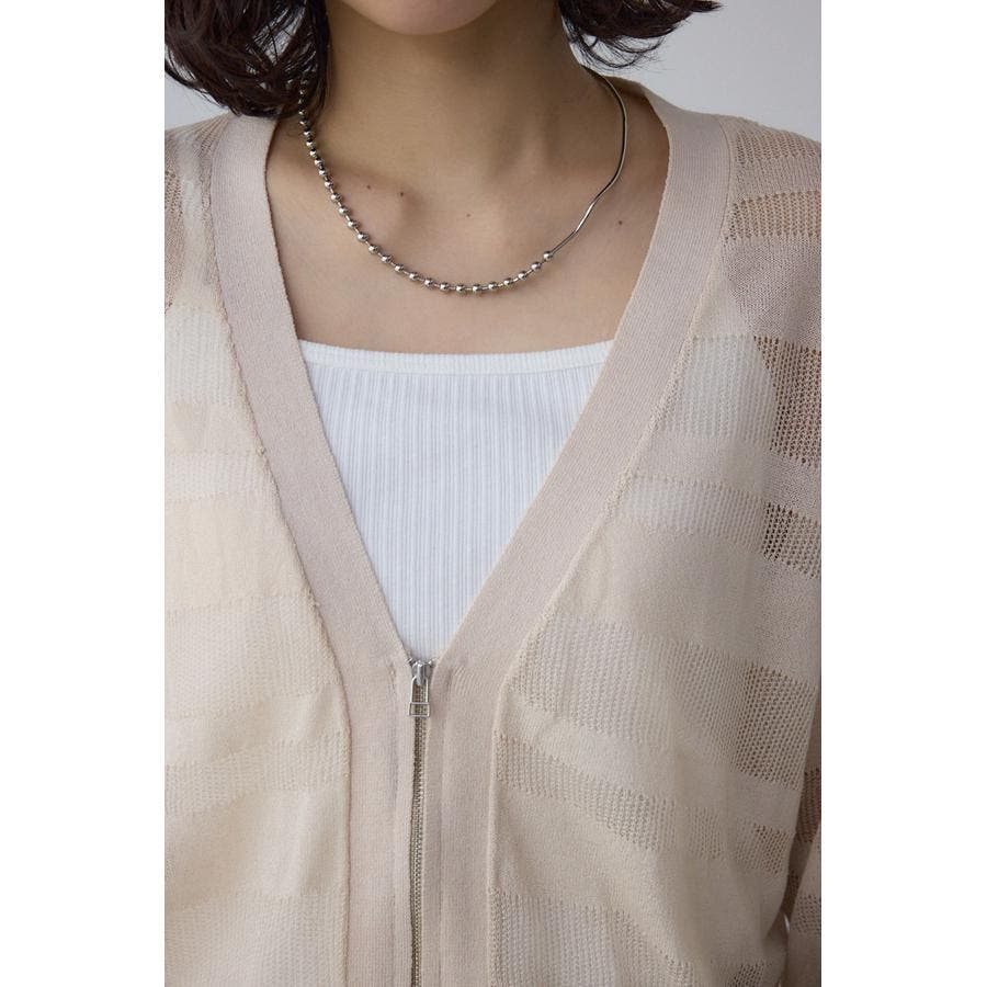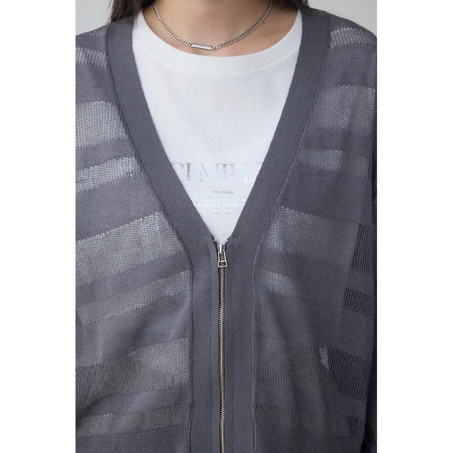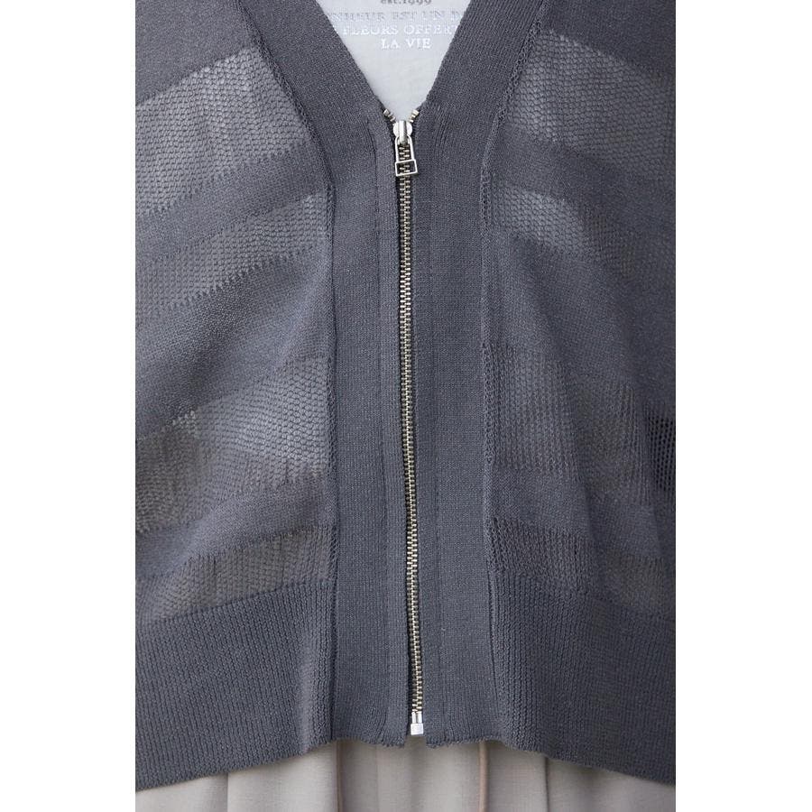 メッシュ編みのシアーボーダー柄のジップカーディガン。