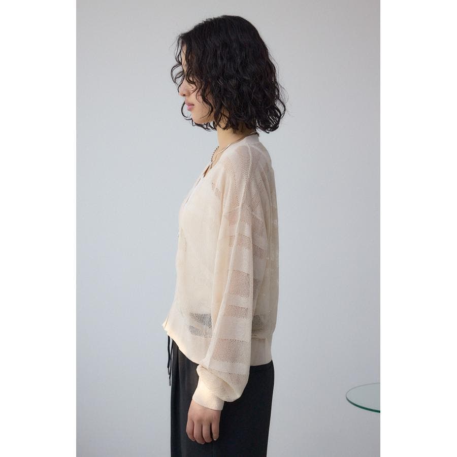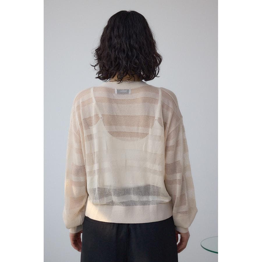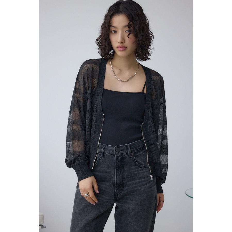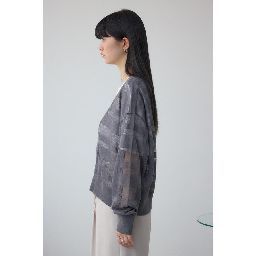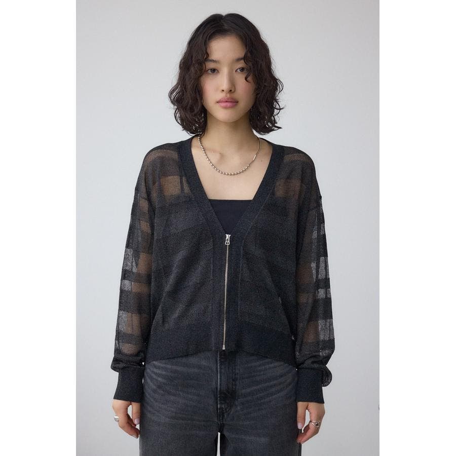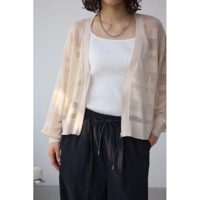 メッシュ編みのシアーボーダー柄のジップカーディガン。