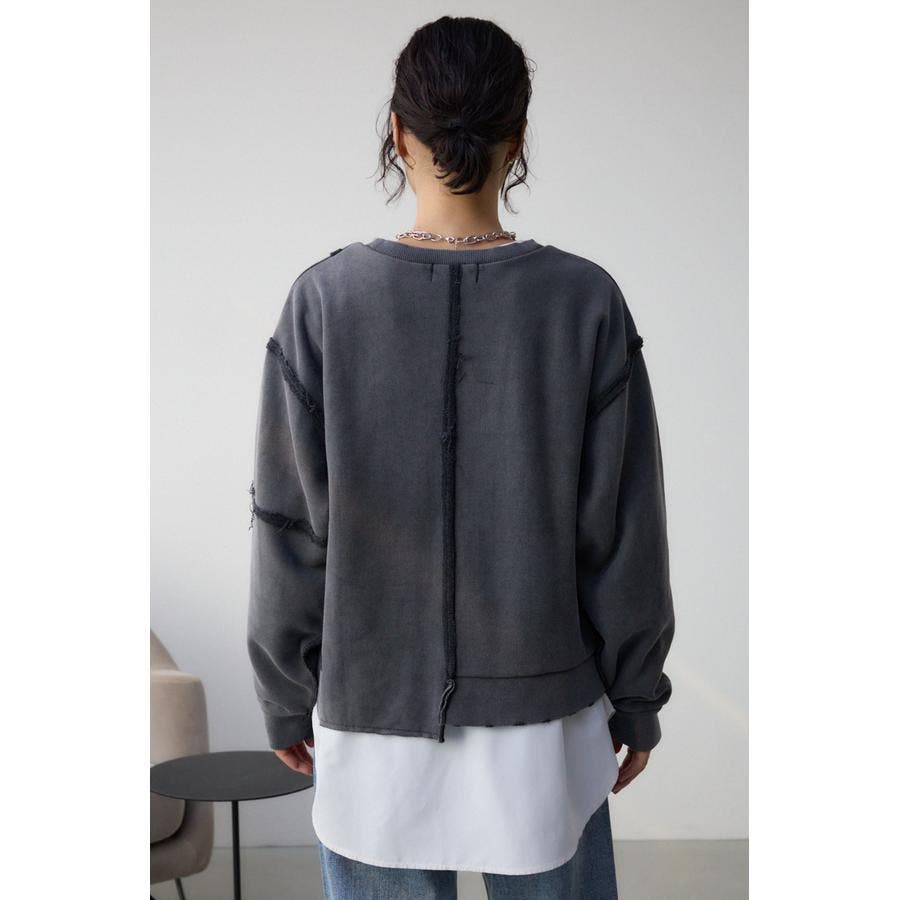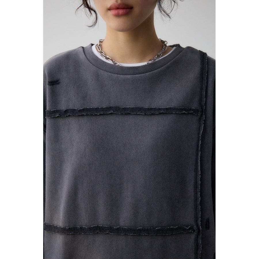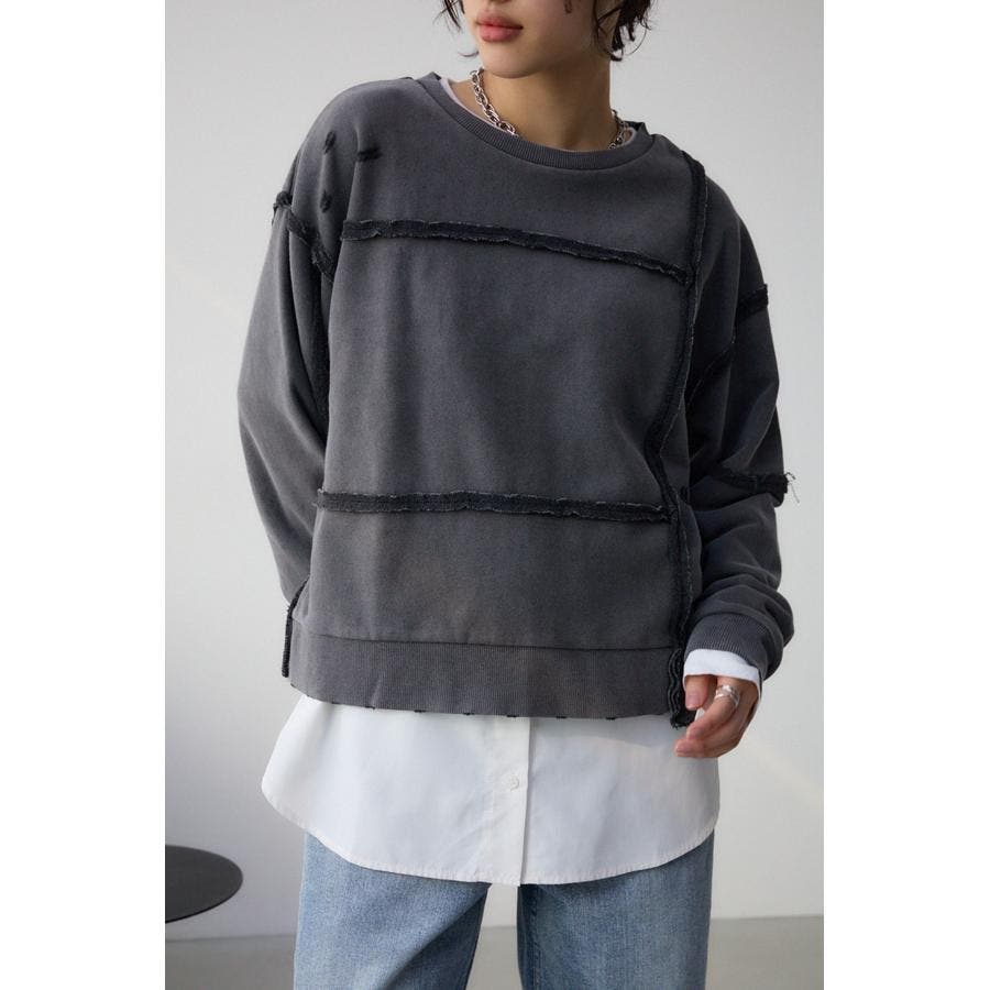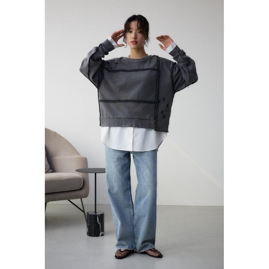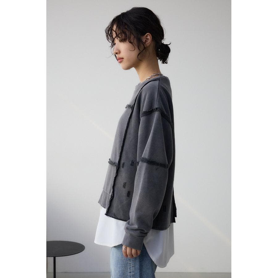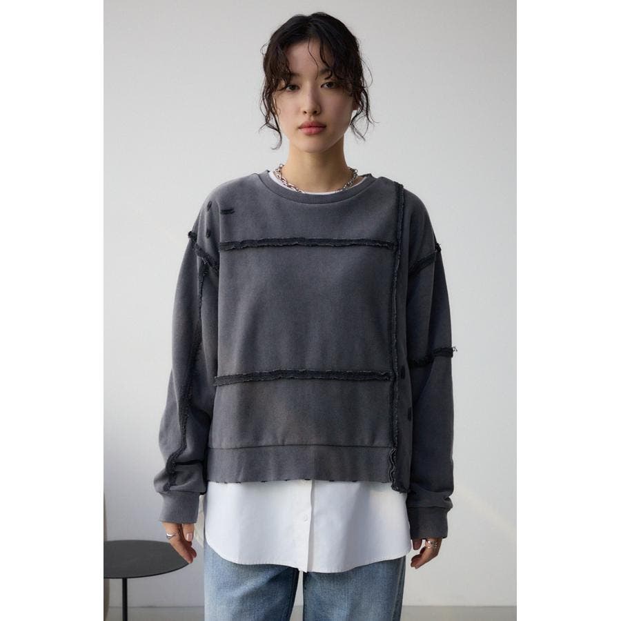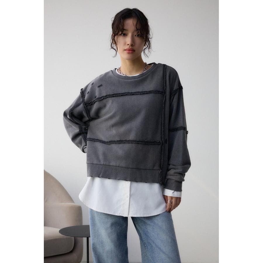 身頃の切替えが表情を出したダメージ加工のスウェットトップスです。