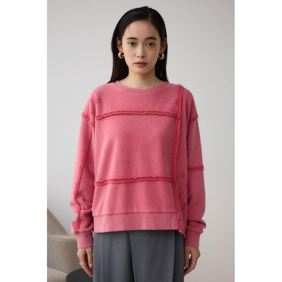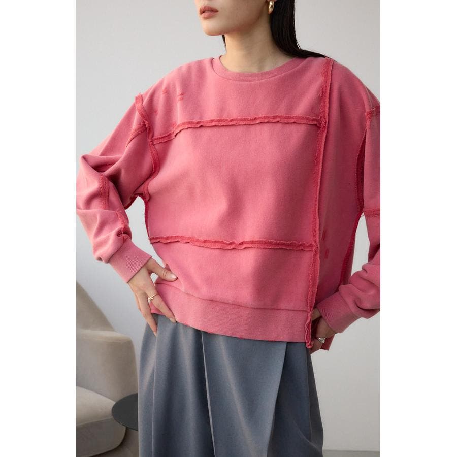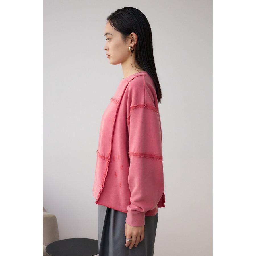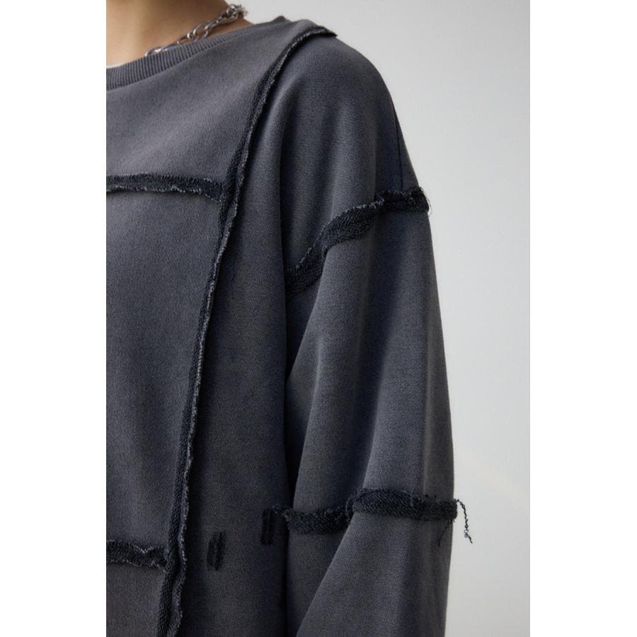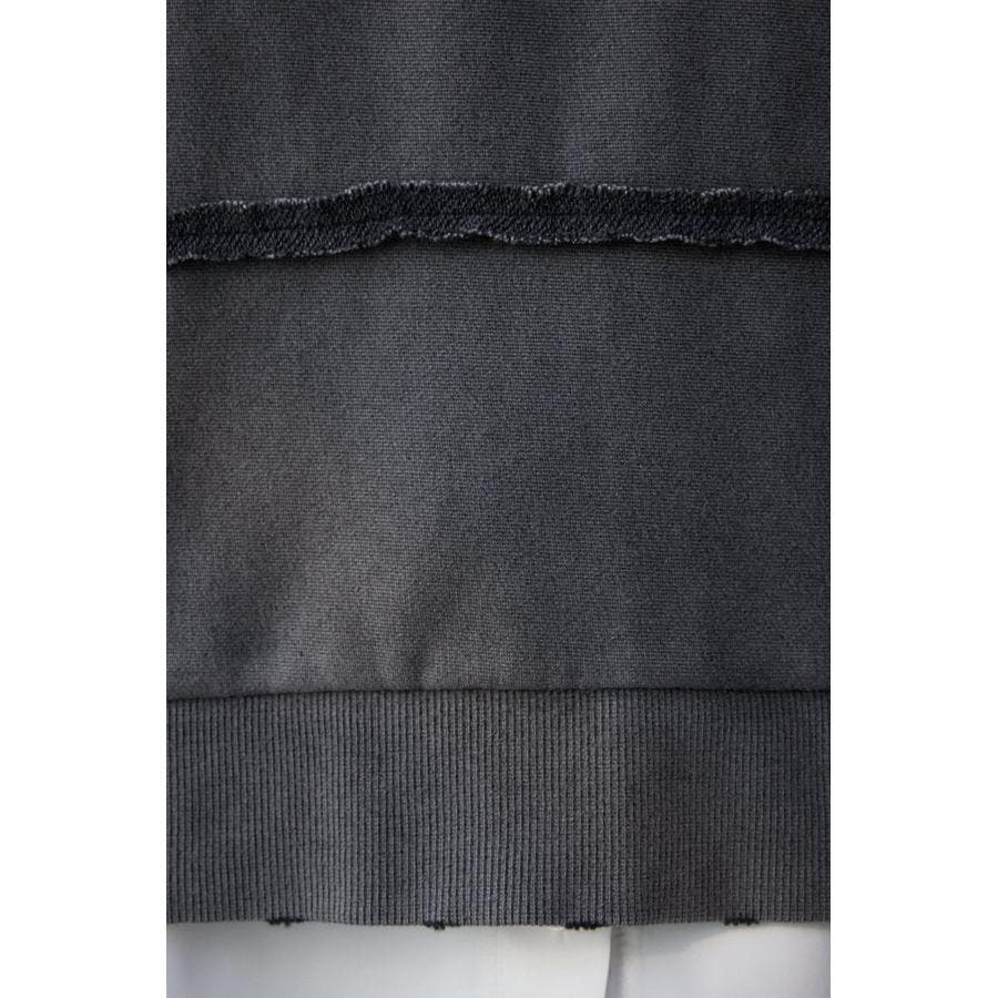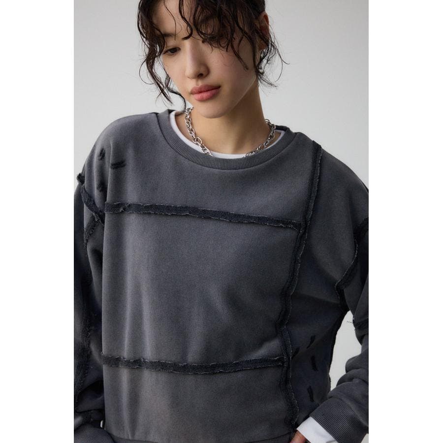身頃の切替えが表情を出したダメージ加工のスウェットトップスです。