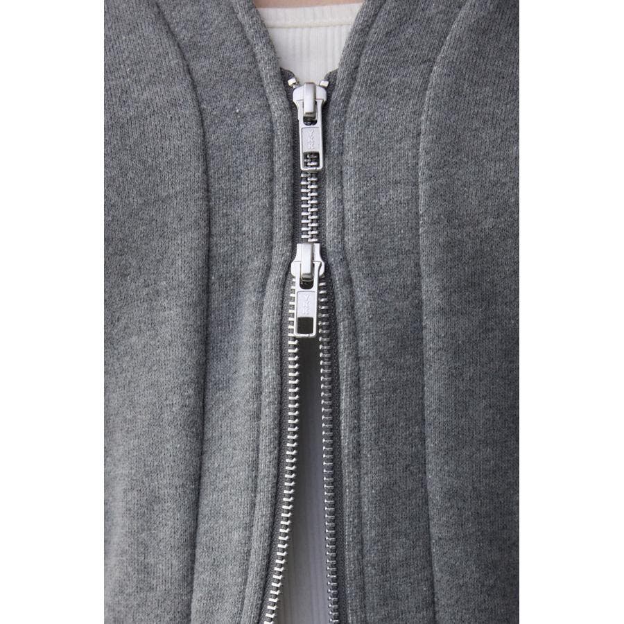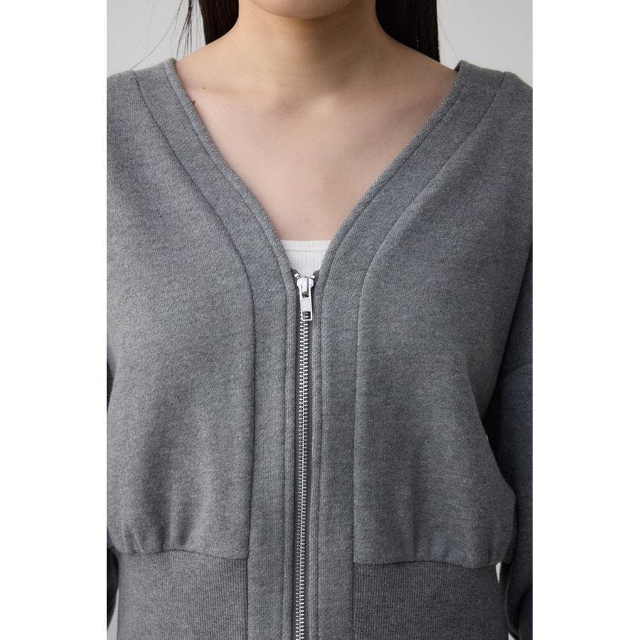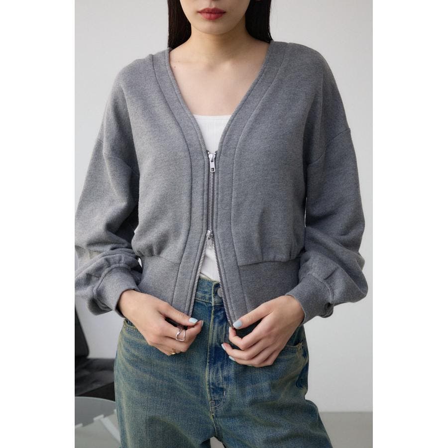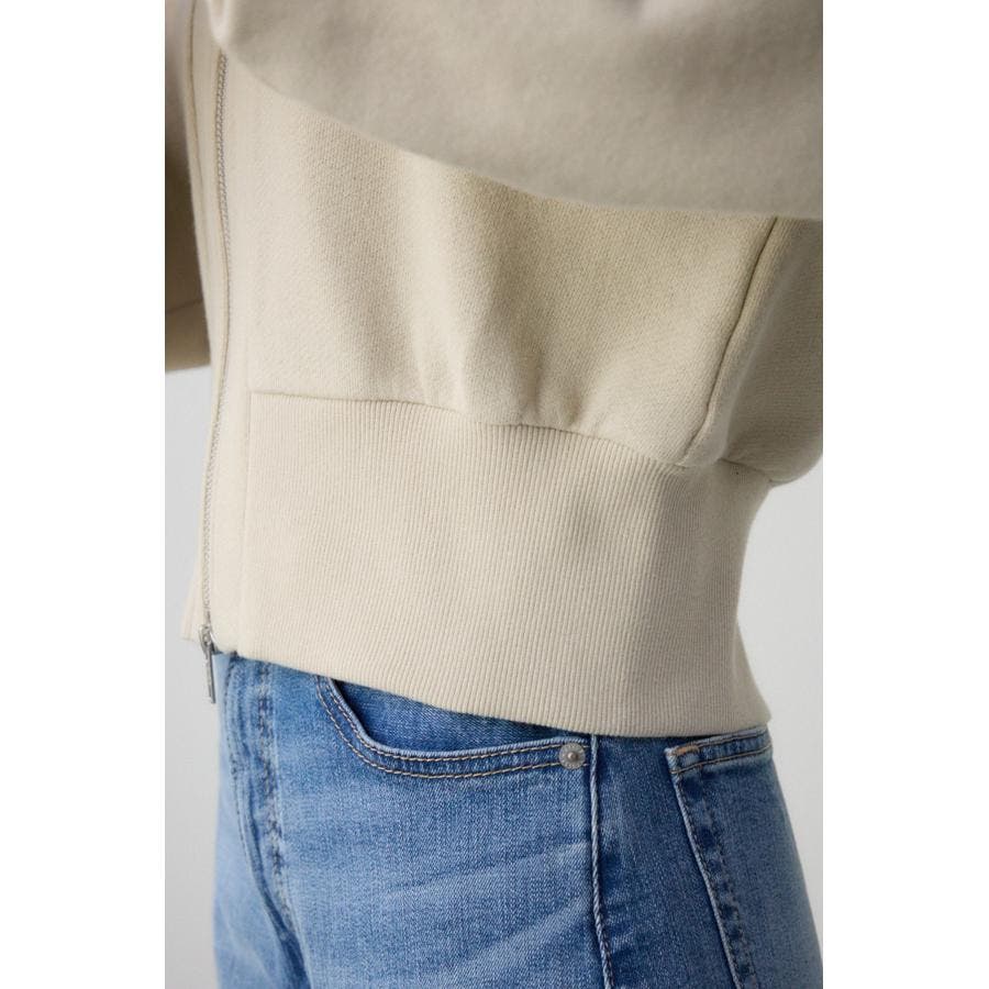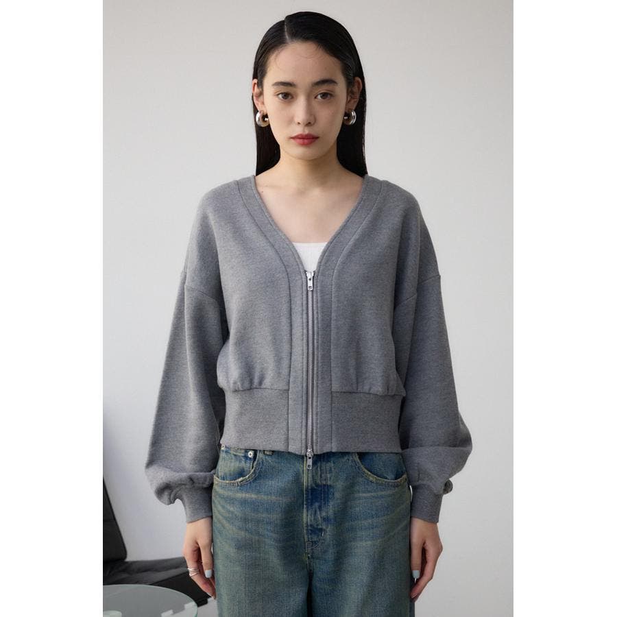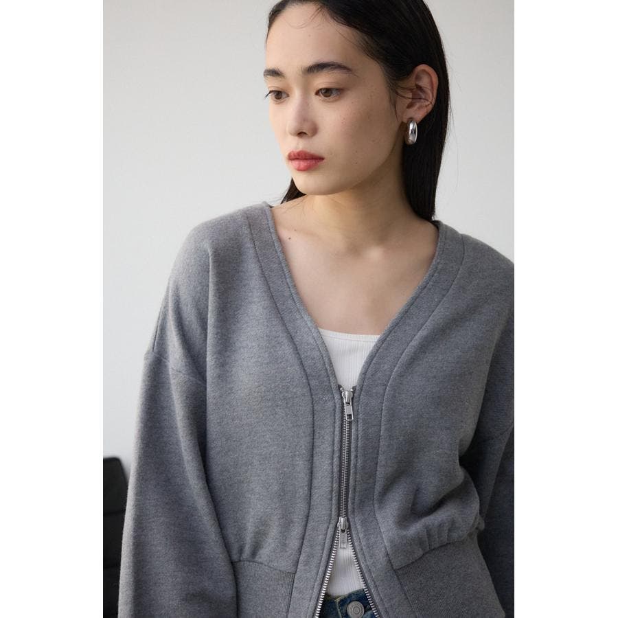前開きでZIP使いのショート丈裏毛カーディガン。