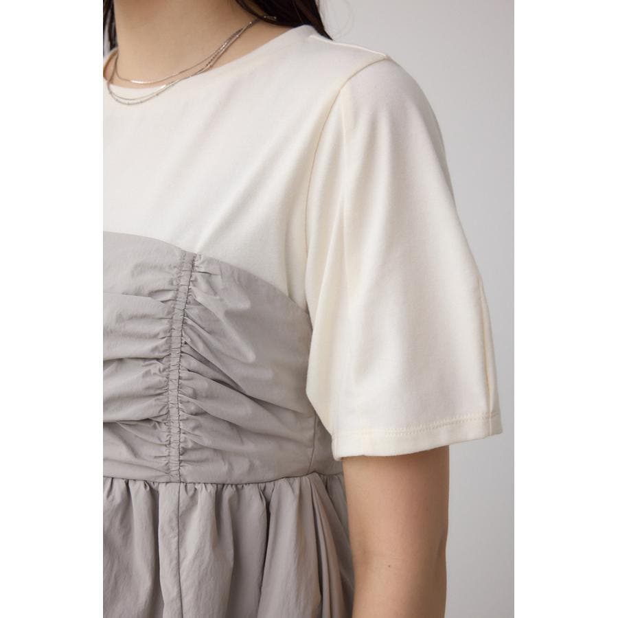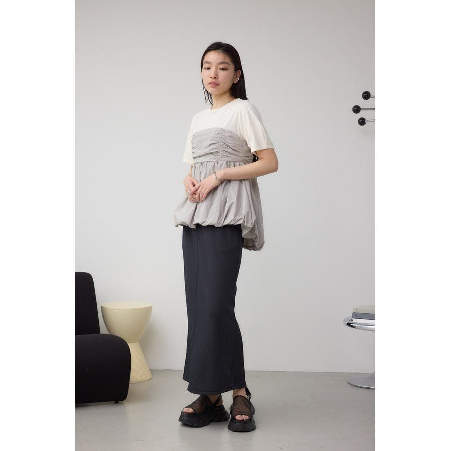 柔らかくて着やすいカットソーに、裾にバルーンを施したビスチェ風の布帛がポイントのトップスです。