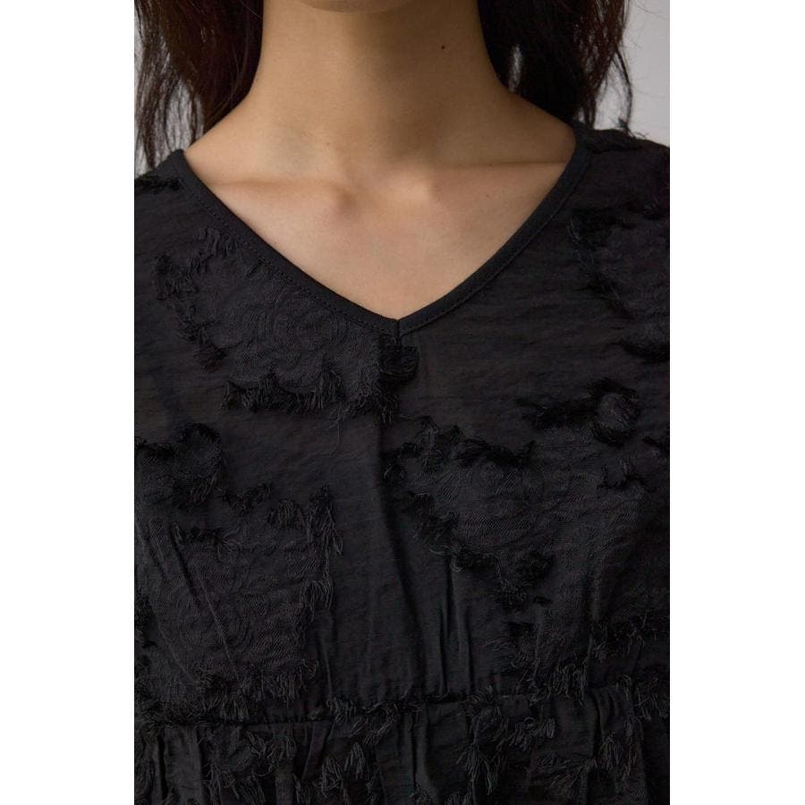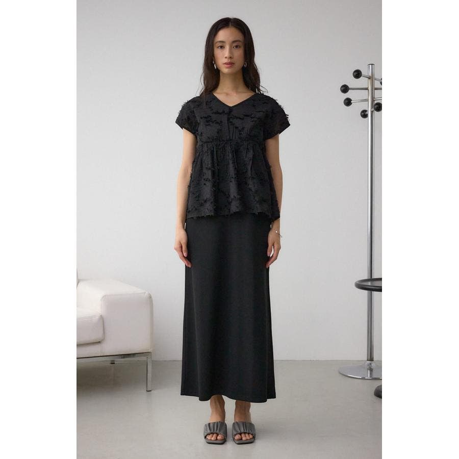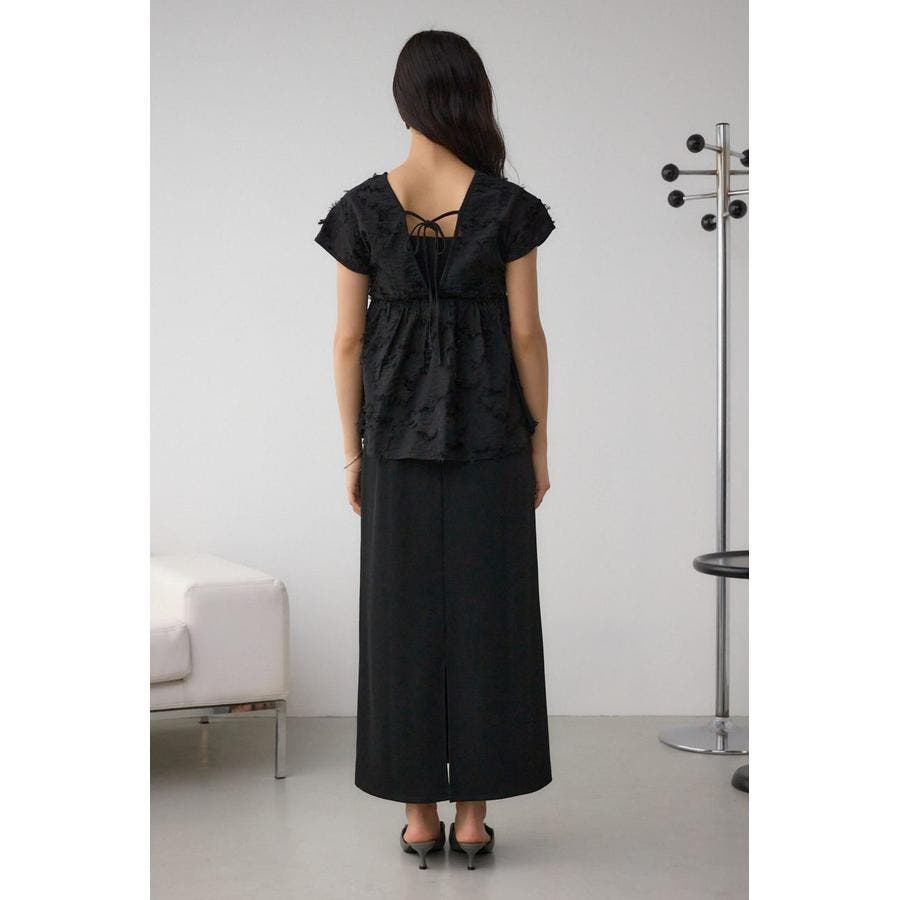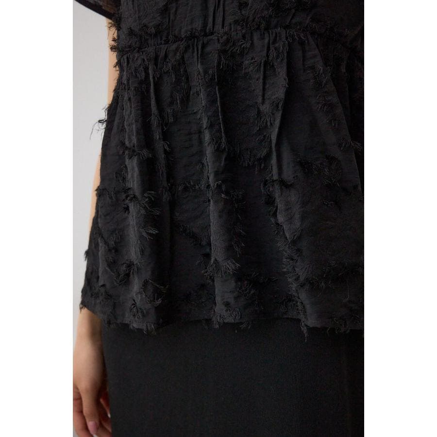トップスの立体的なジャガード柄とフリンジのディティールが、シンプルながらも個性的な印象を与えます。