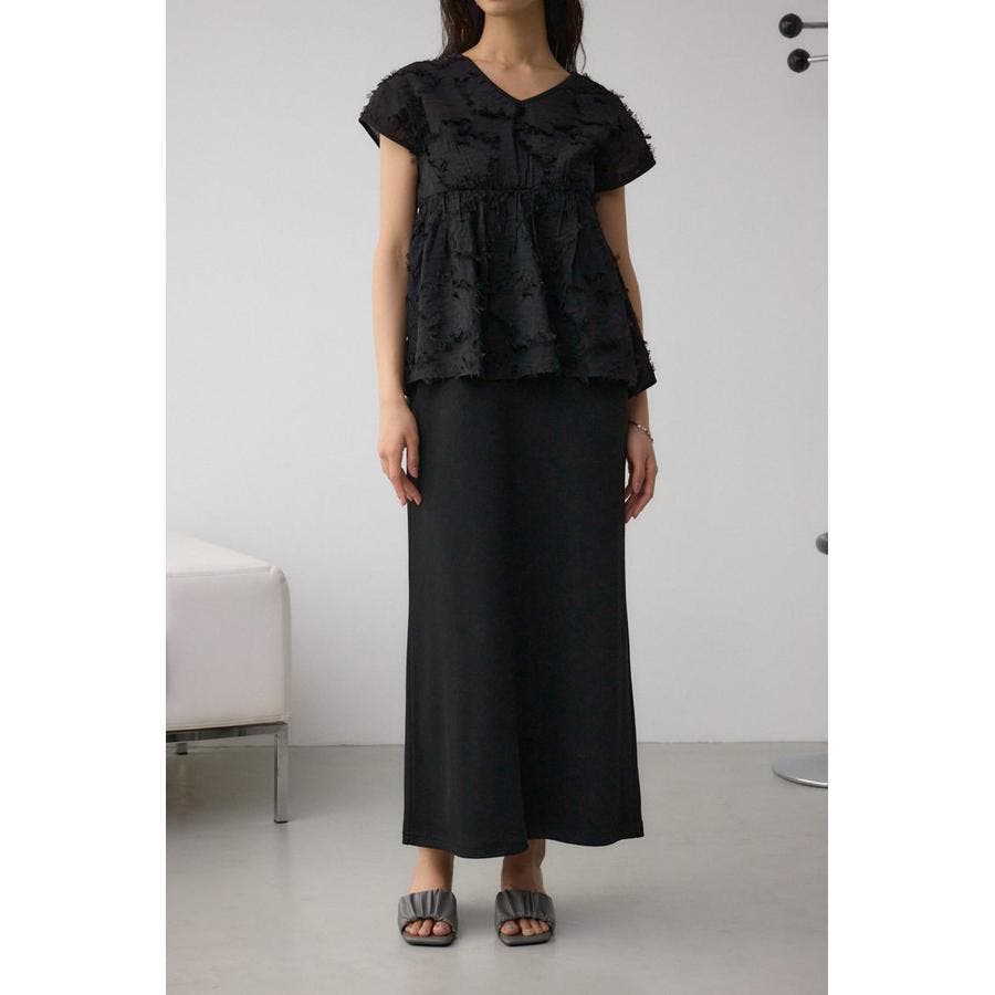 フリンジが特徴のジャガード総柄生地を使用したトップスと、もっちりとしたやや厚手で細ピッチのリブを使用したワンピースです。