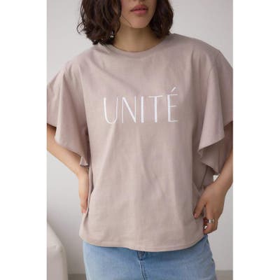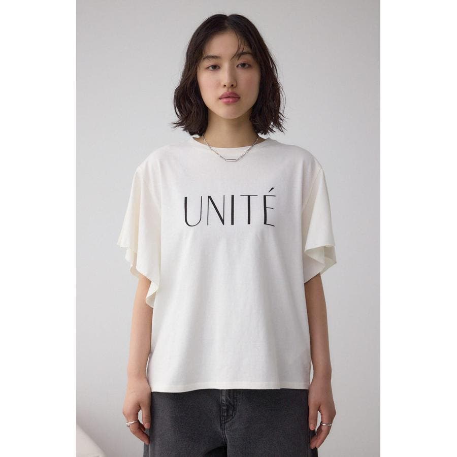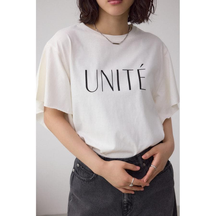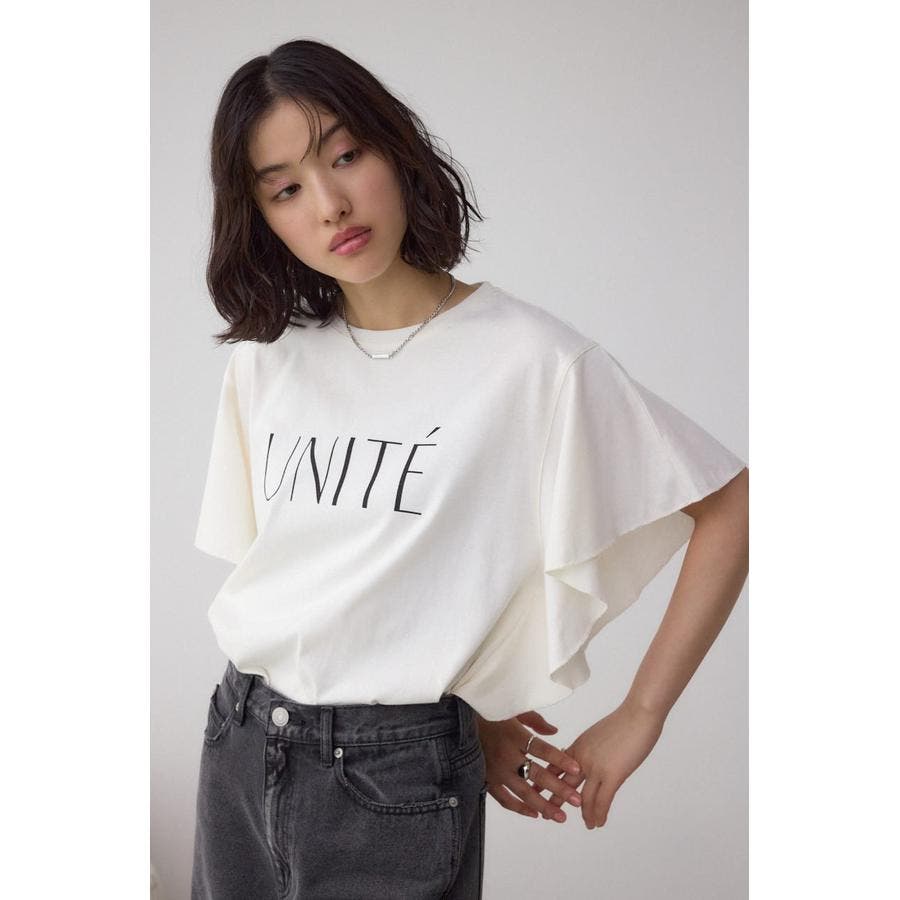 ラッフルスリーブとロゴプリントで魅せる大人のTシャツスタイルです。