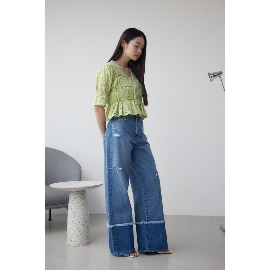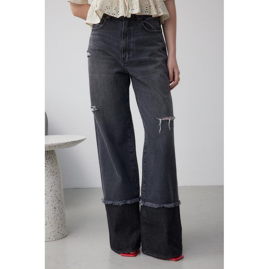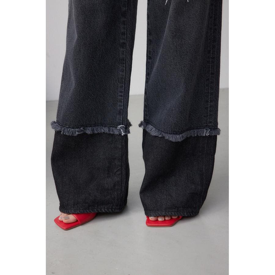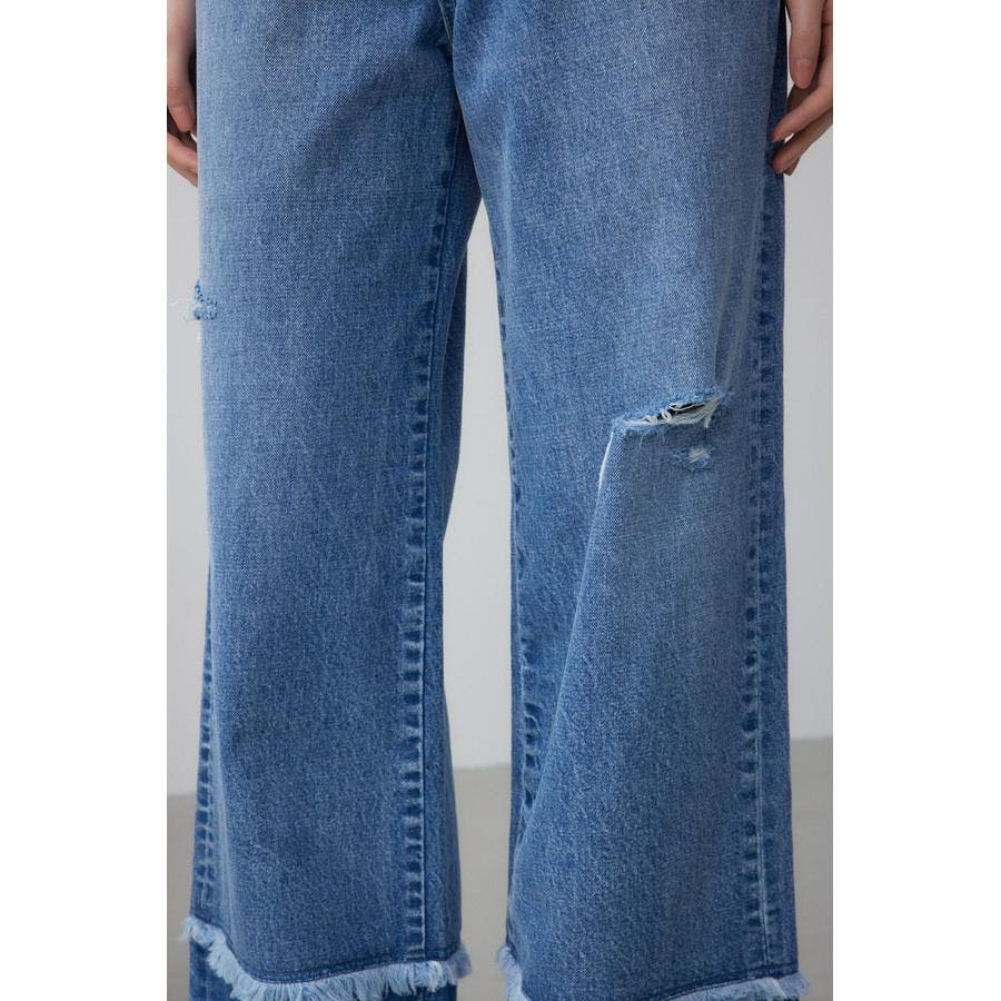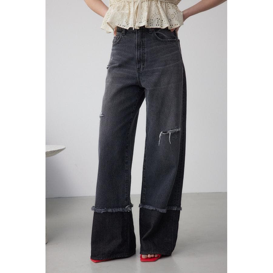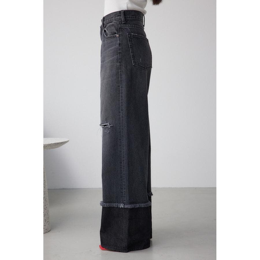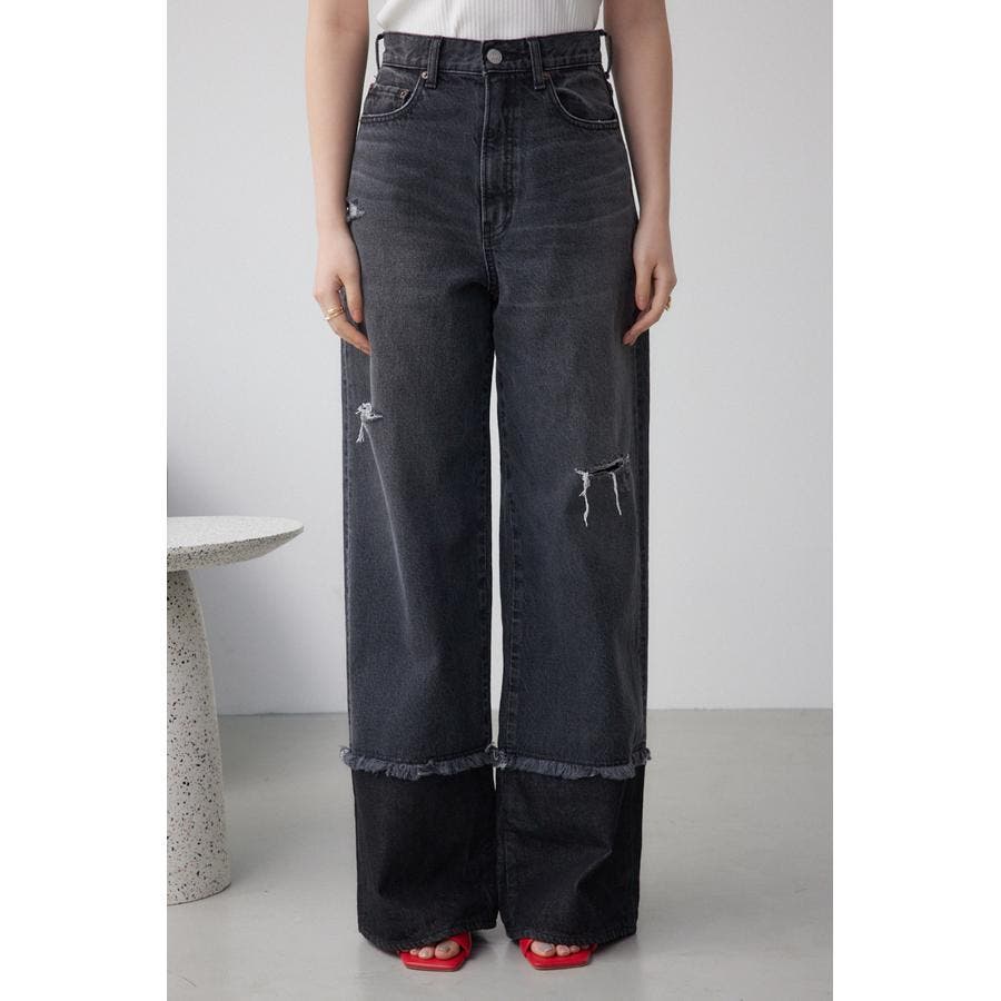 裾の切り替えとフリンジデザインがポイントのワイドシルエットデニムです。