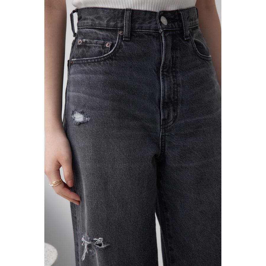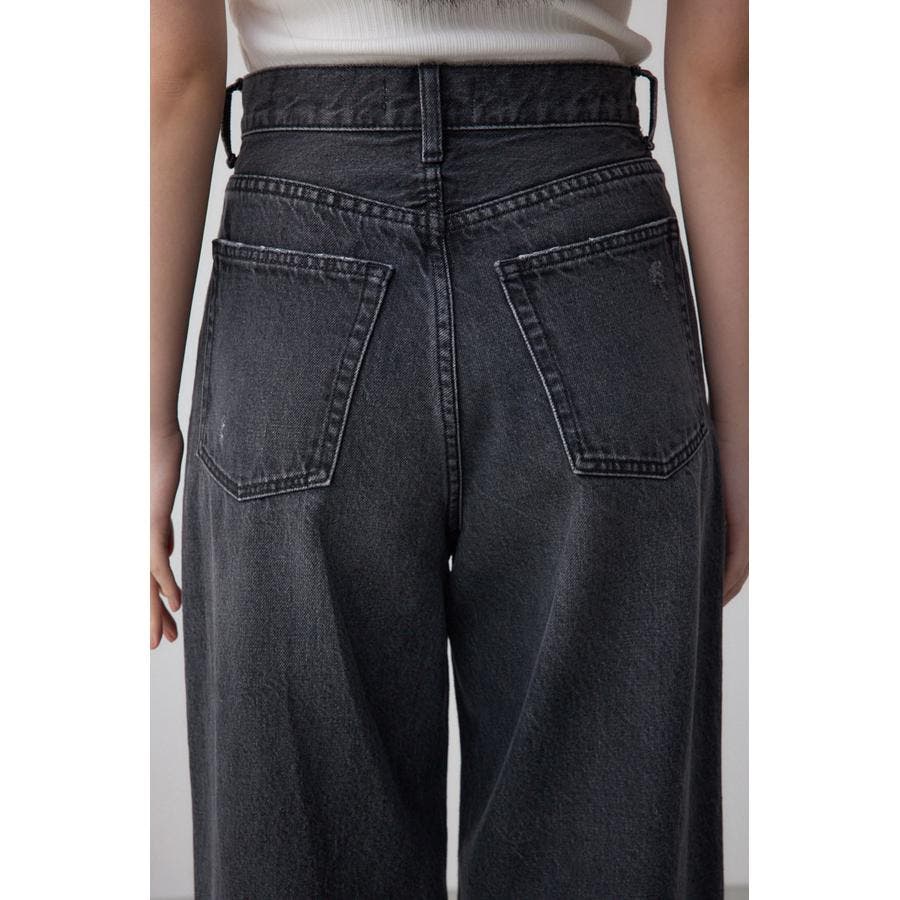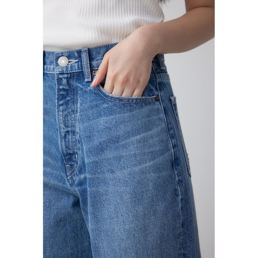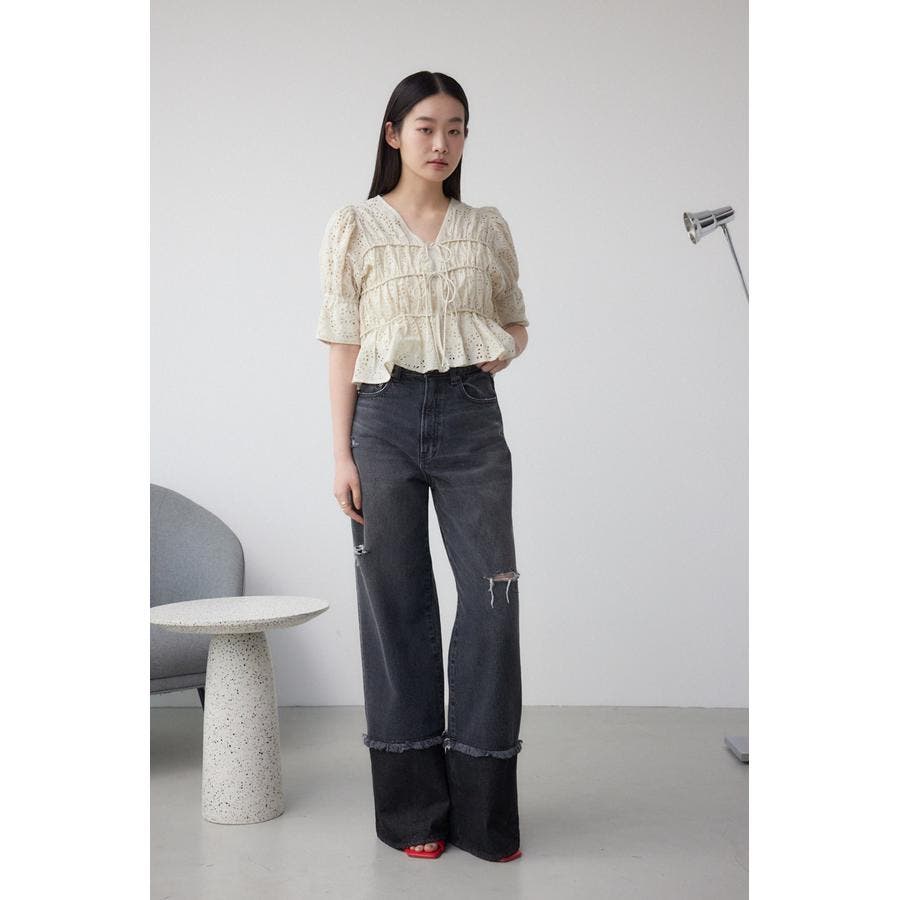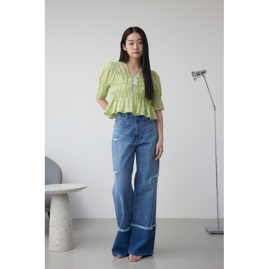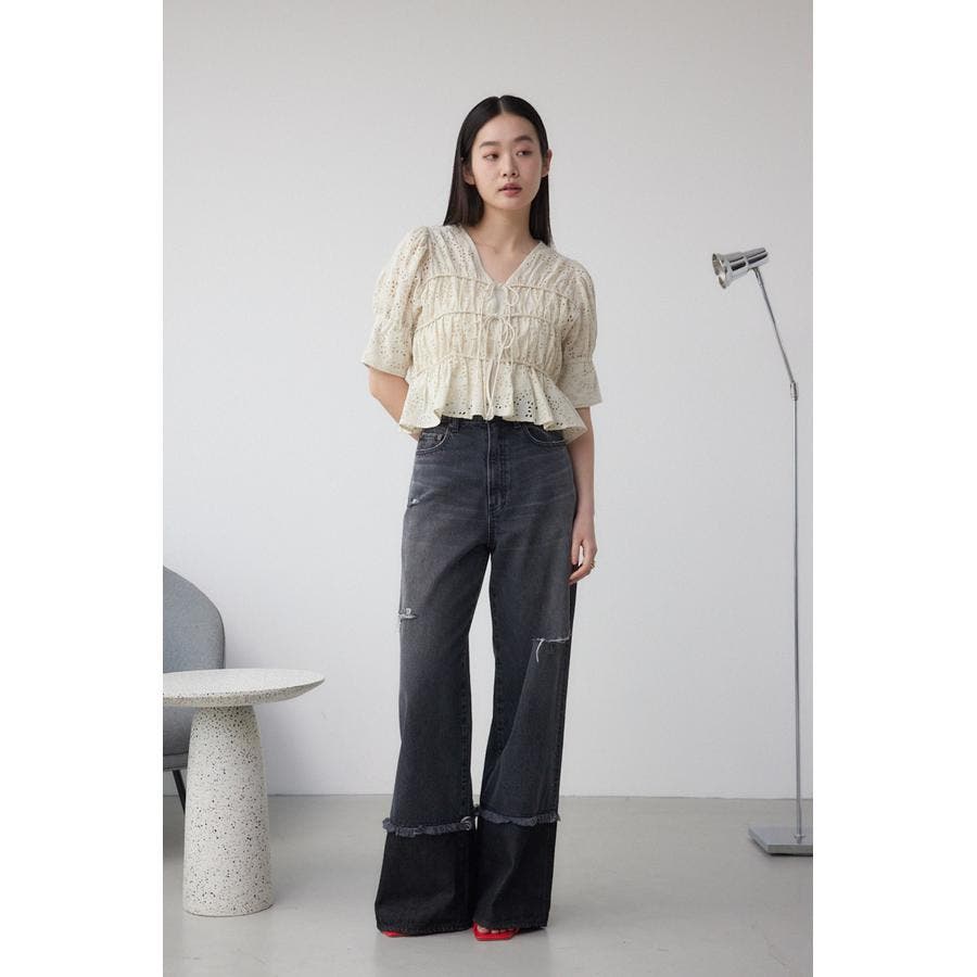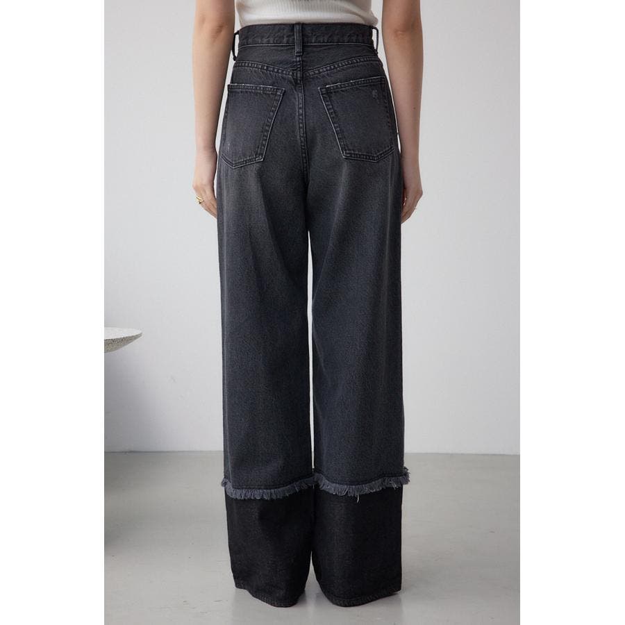 裾の切り替えとフリンジデザインがポイントのワイドシルエットデニムです。