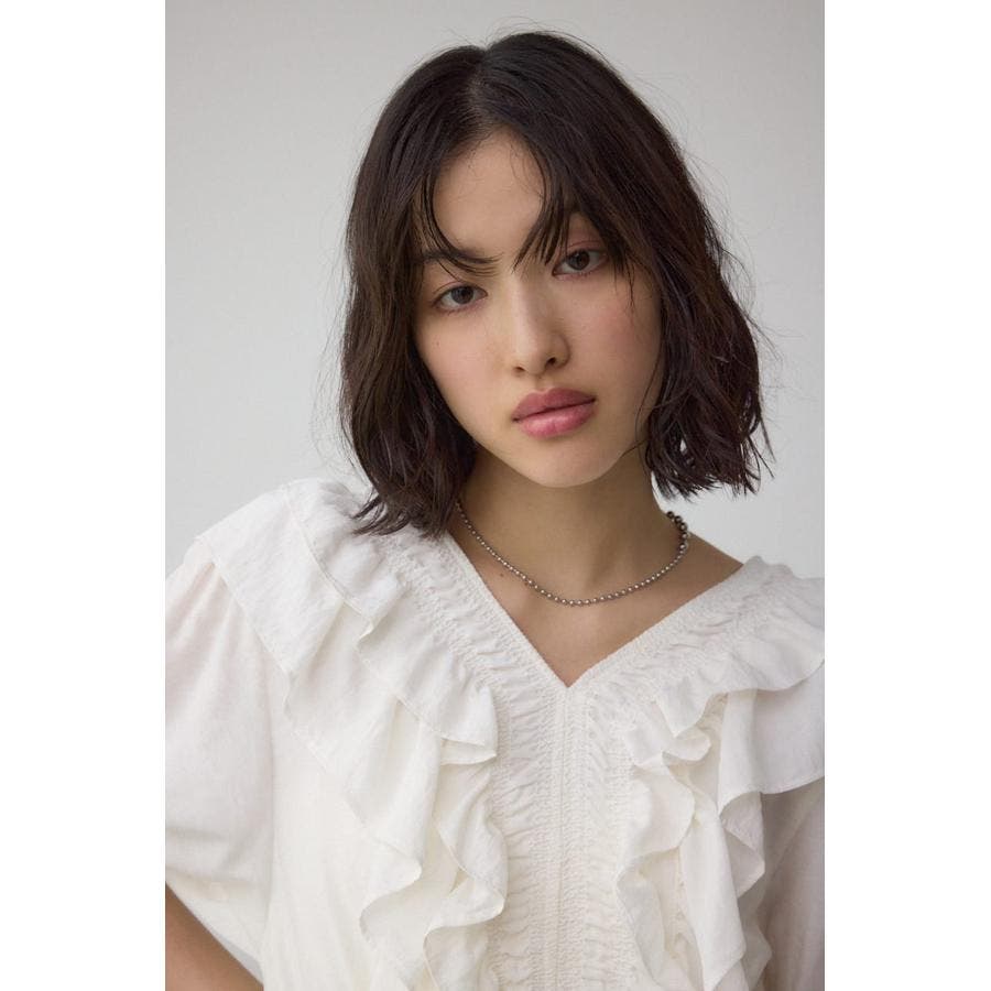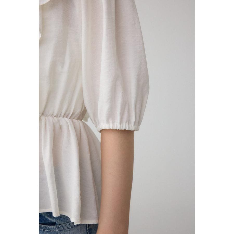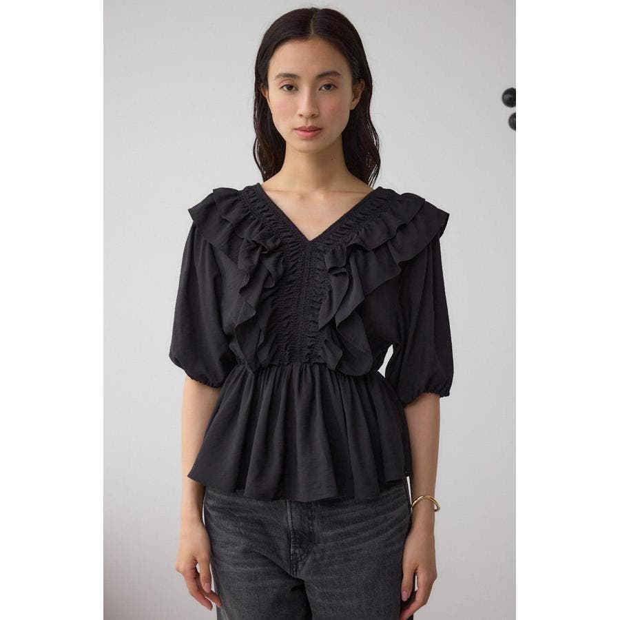 大きめのラッフルとシャーリングでトレンド感のあるブラウスです。
