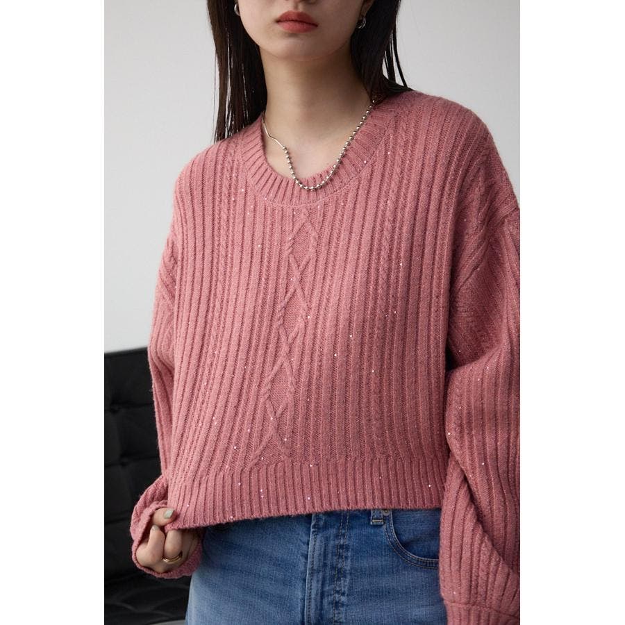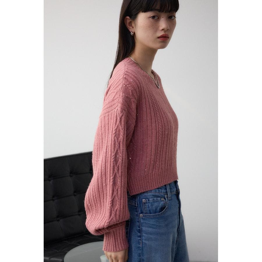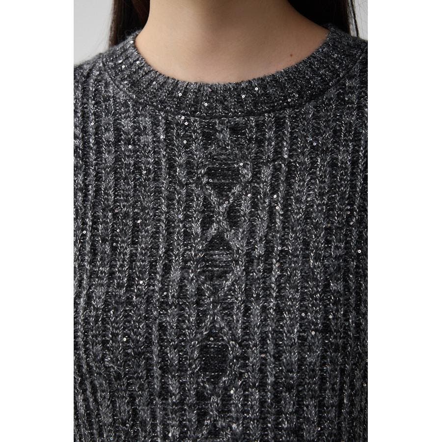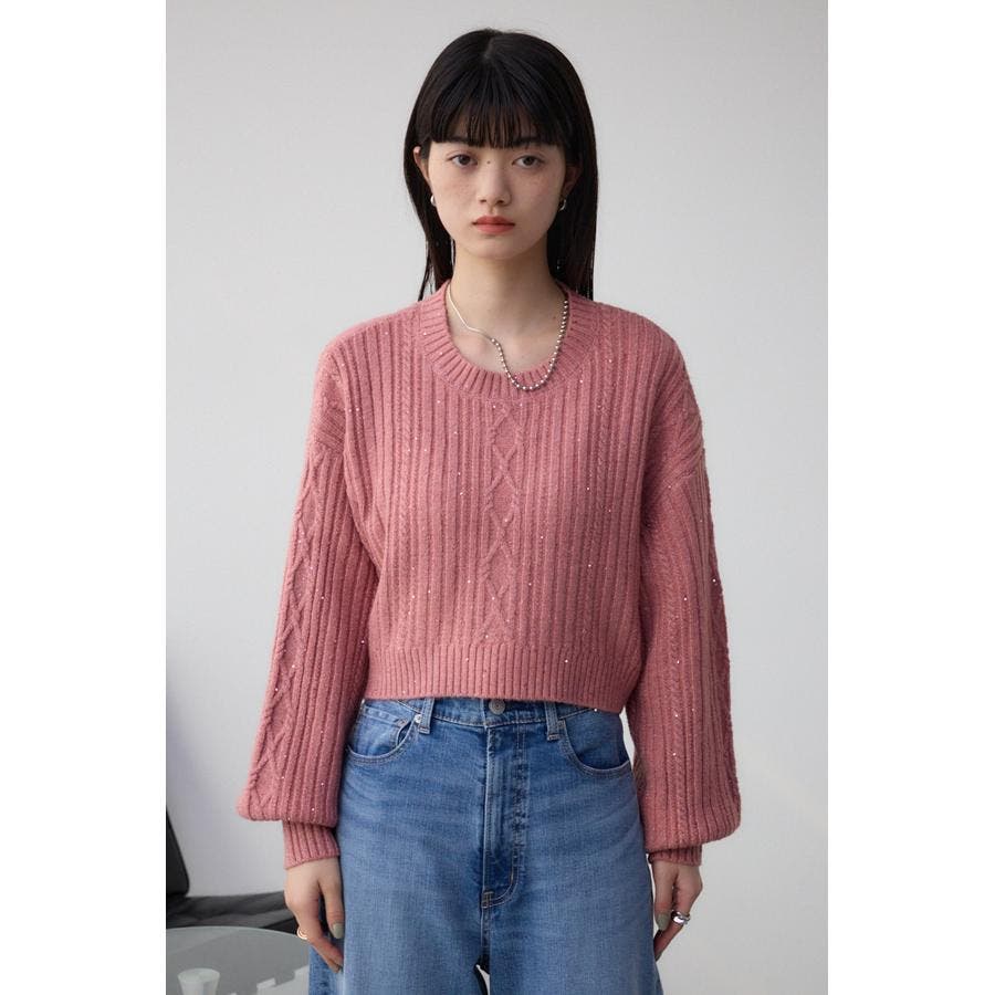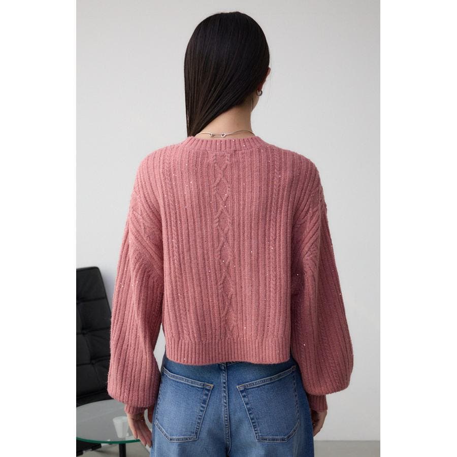 スパンコールとラメを散りばめた短丈ケーブルニット。