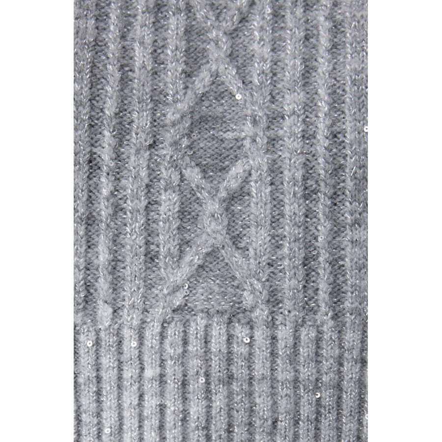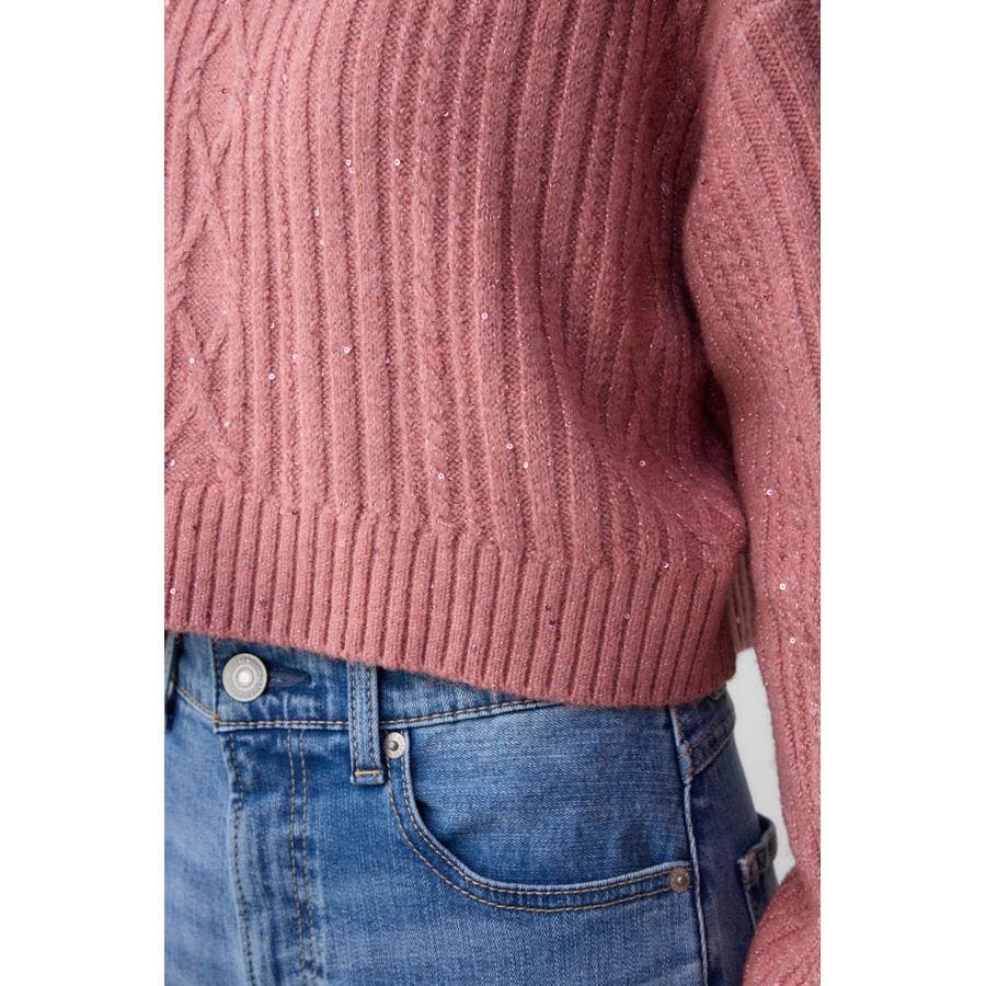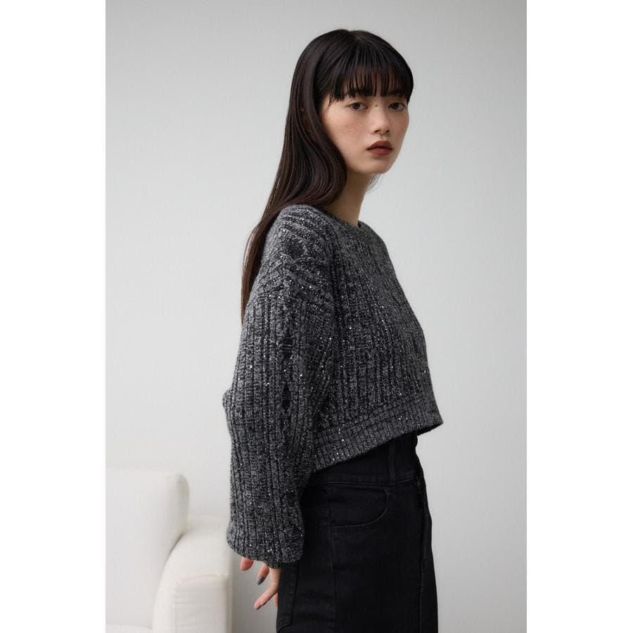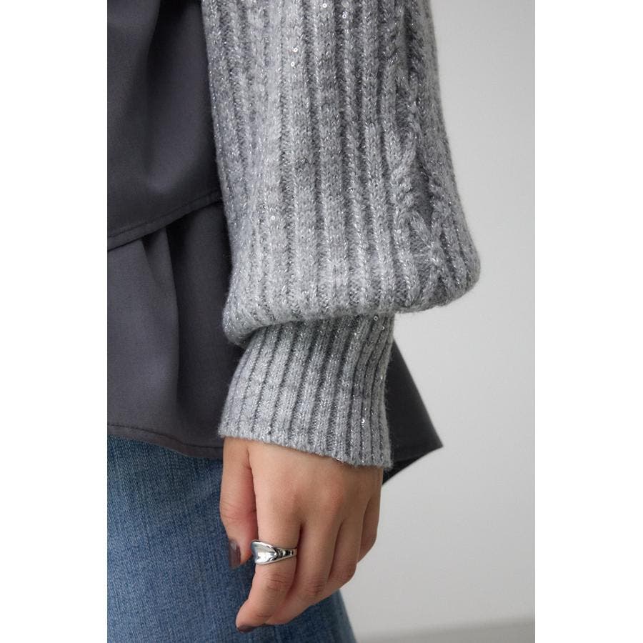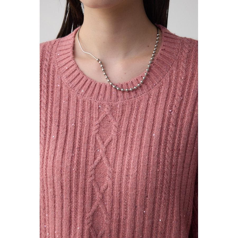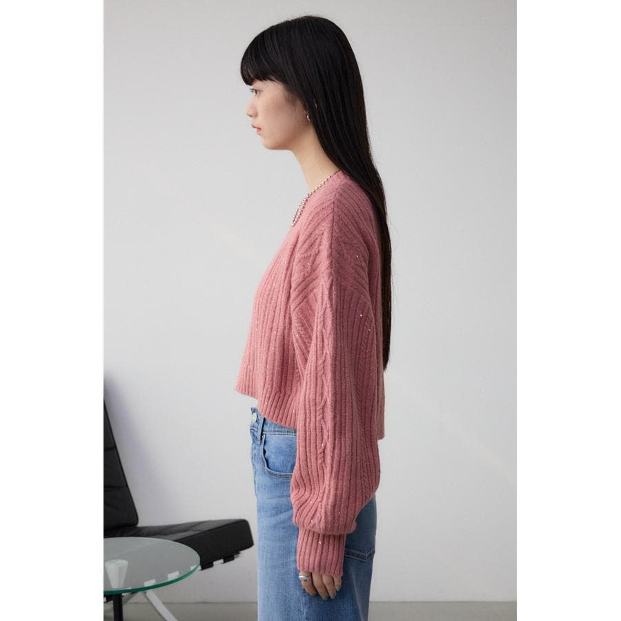 スパンコールとラメを散りばめた短丈ケーブルニット。