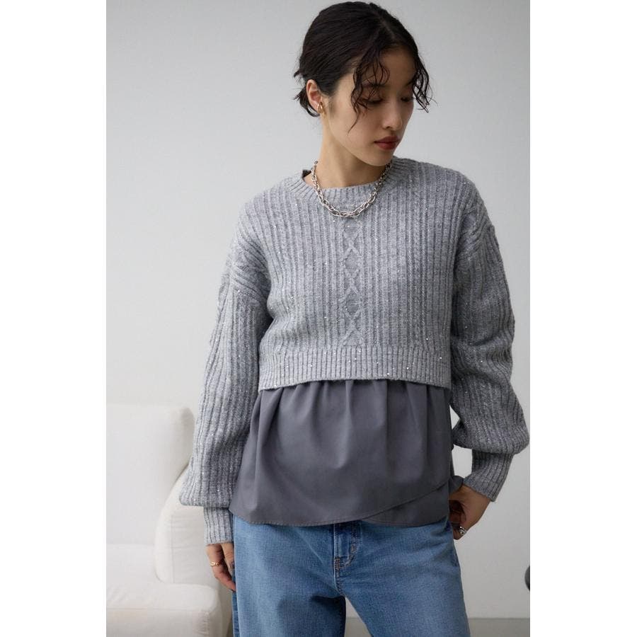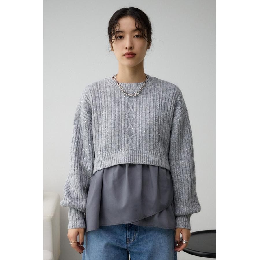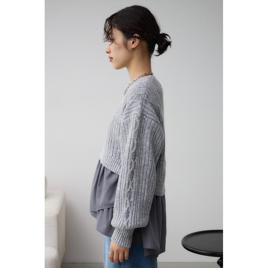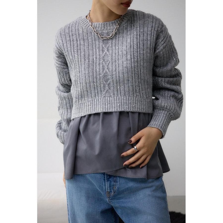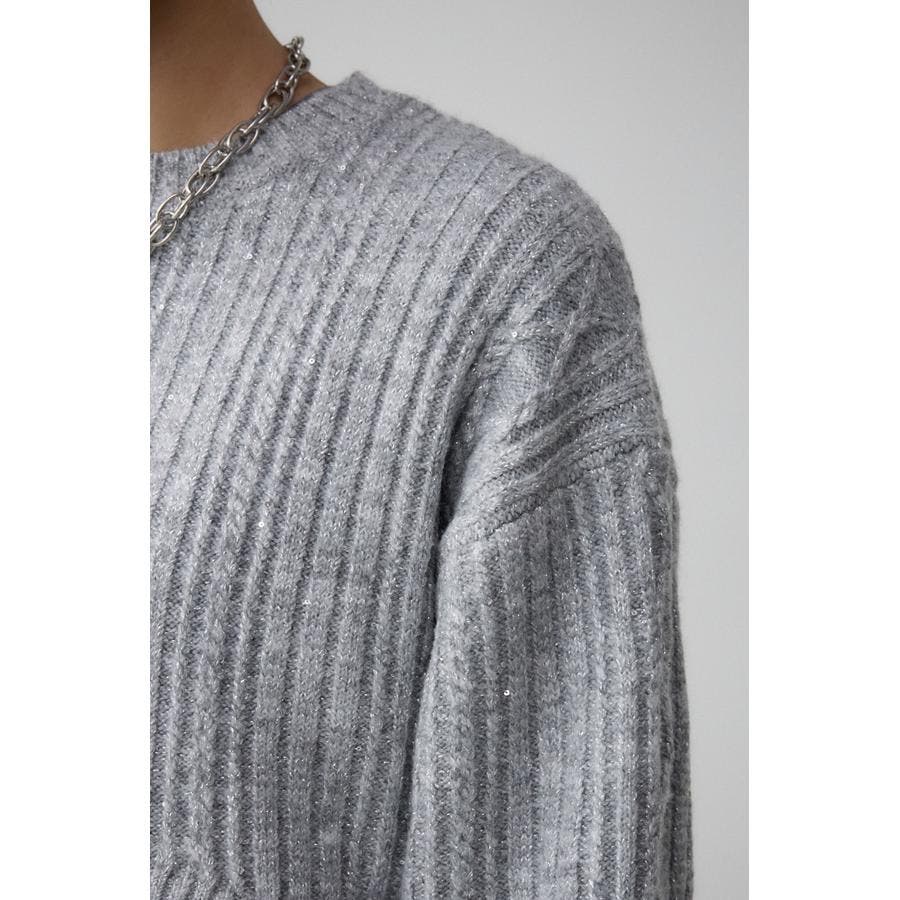スパンコールとラメを散りばめた短丈ケーブルニット。