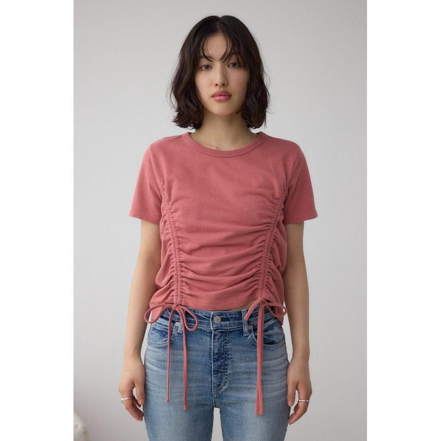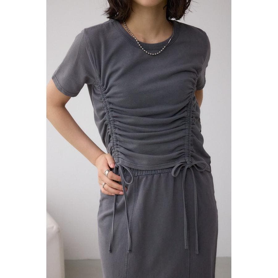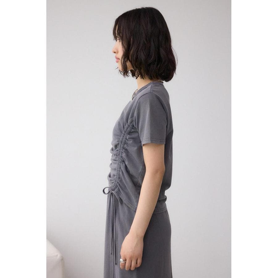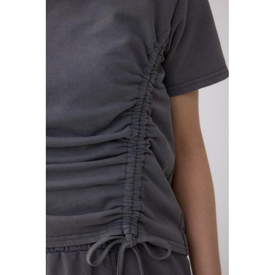 シャーリングディティールと加工を施した、デザインTシャツ。