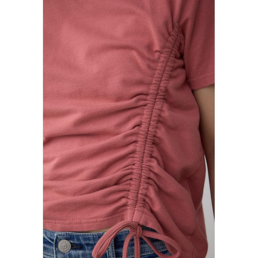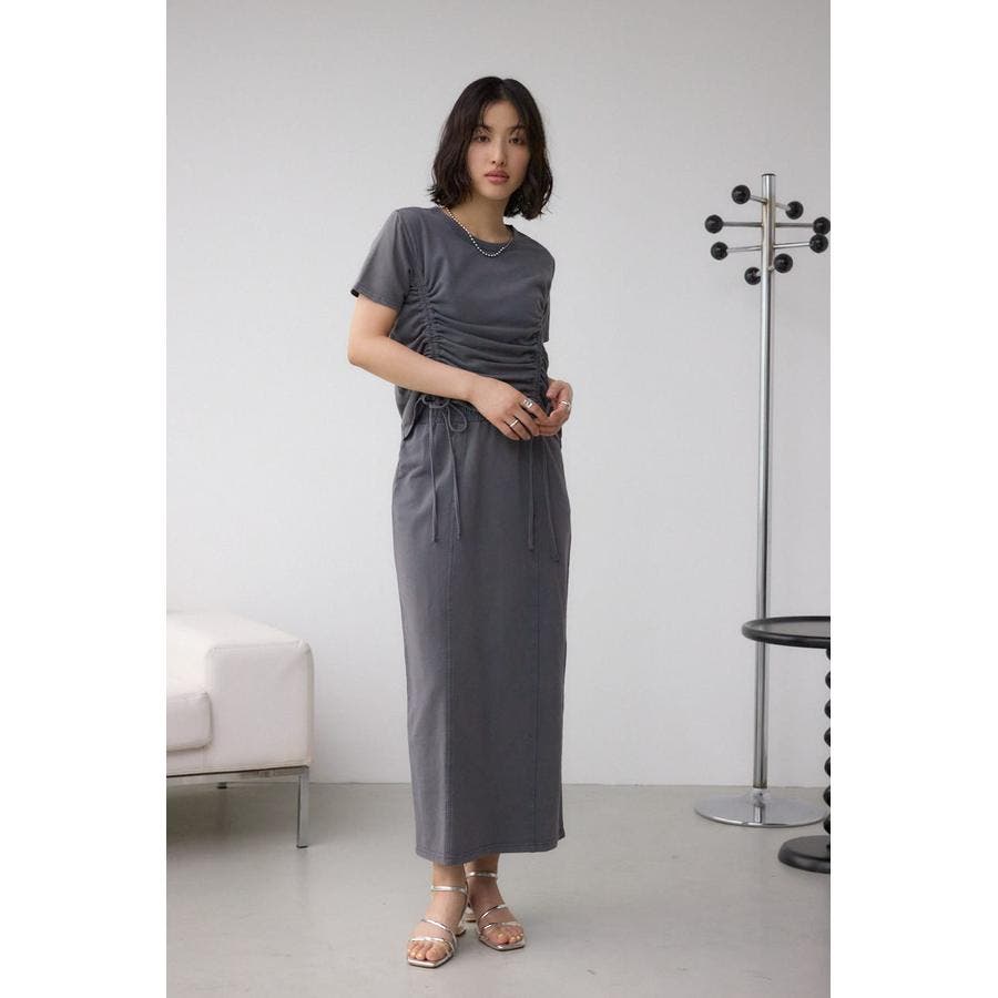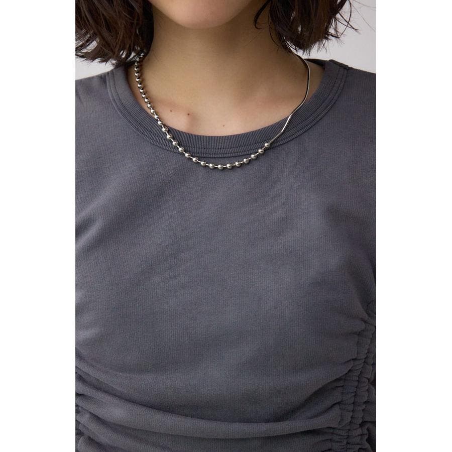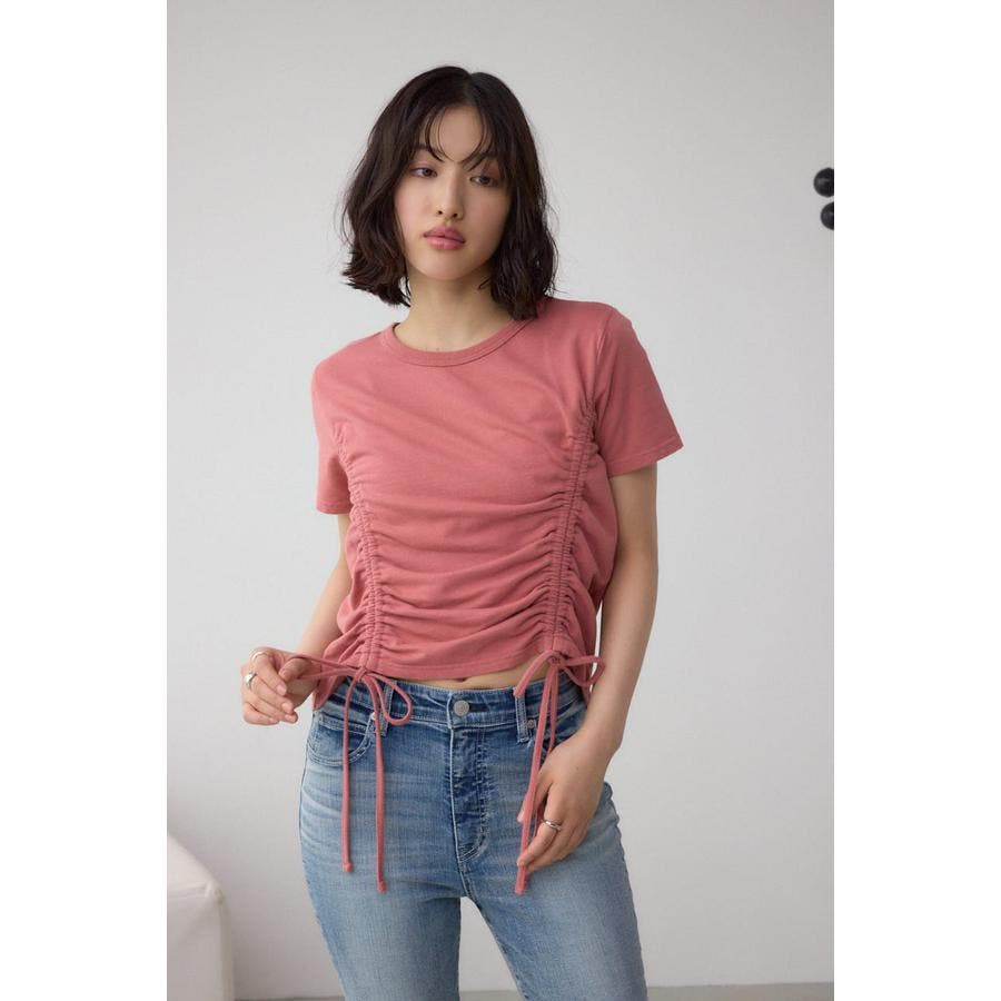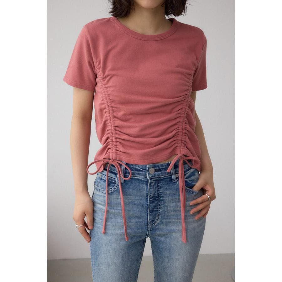 シャーリングディティールと加工を施した、デザインTシャツ。