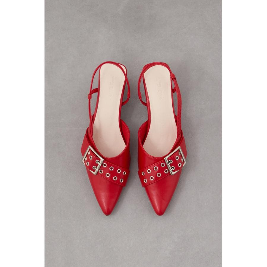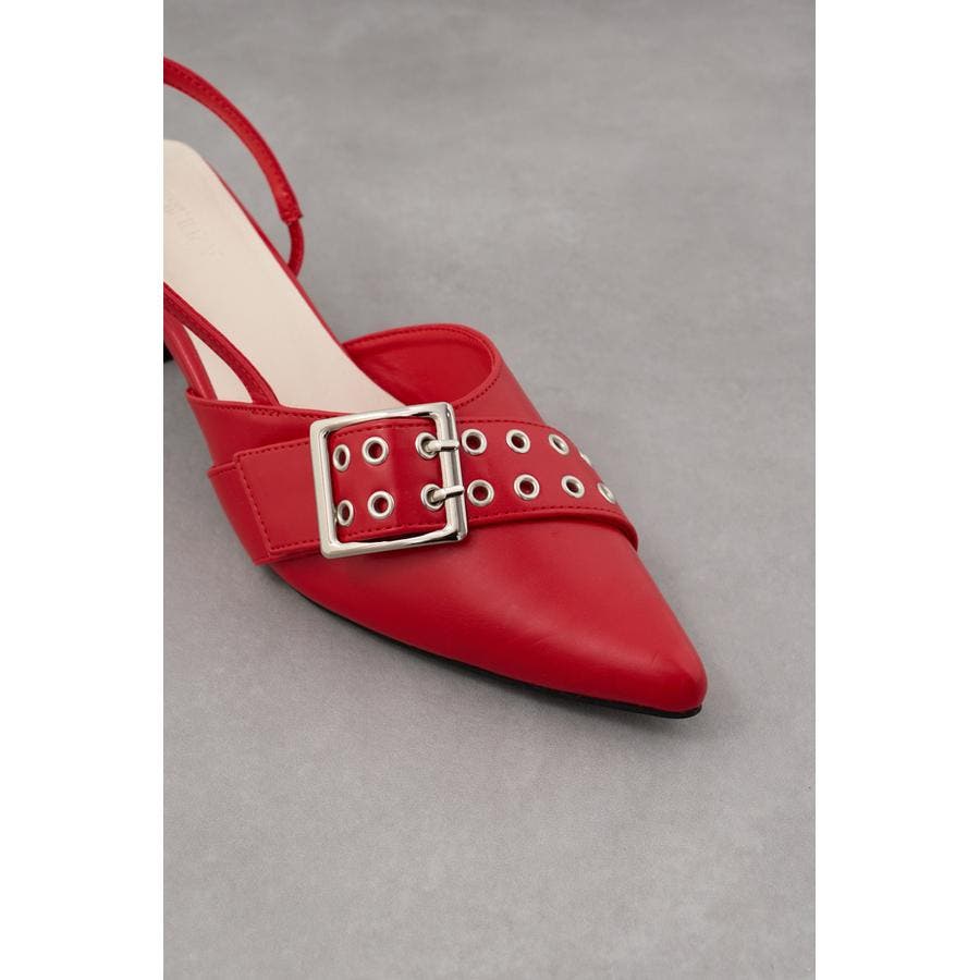 甲部分に太いベルトが斜めに配置されたトレンド感あふれるデザインが特徴の一足です。