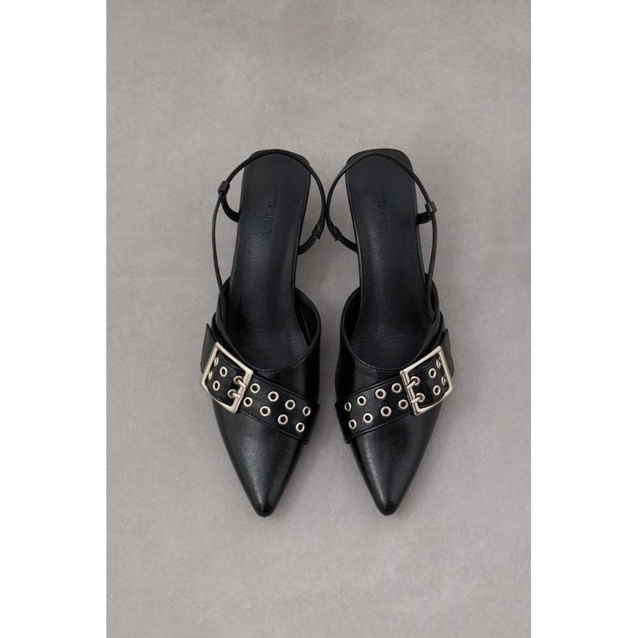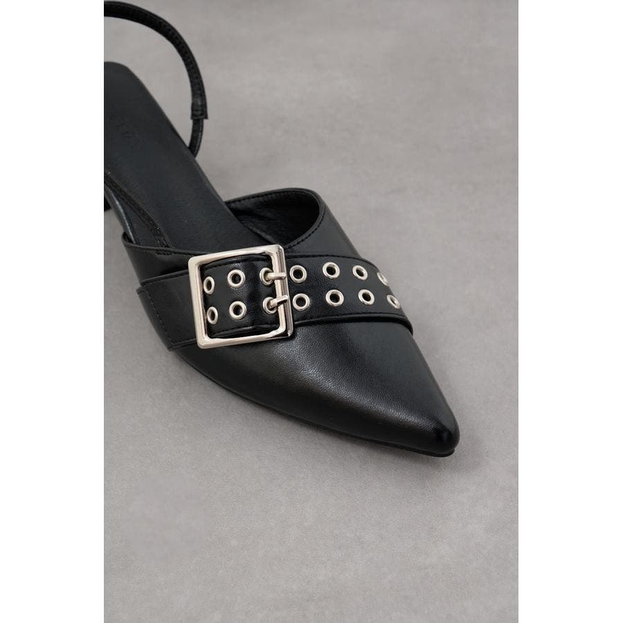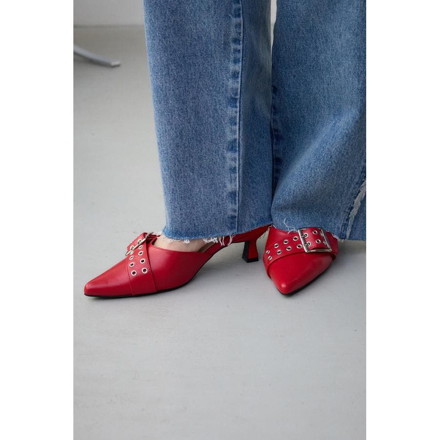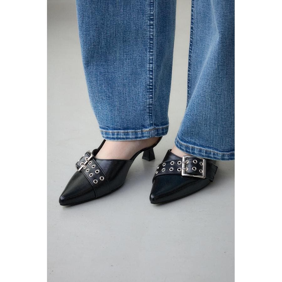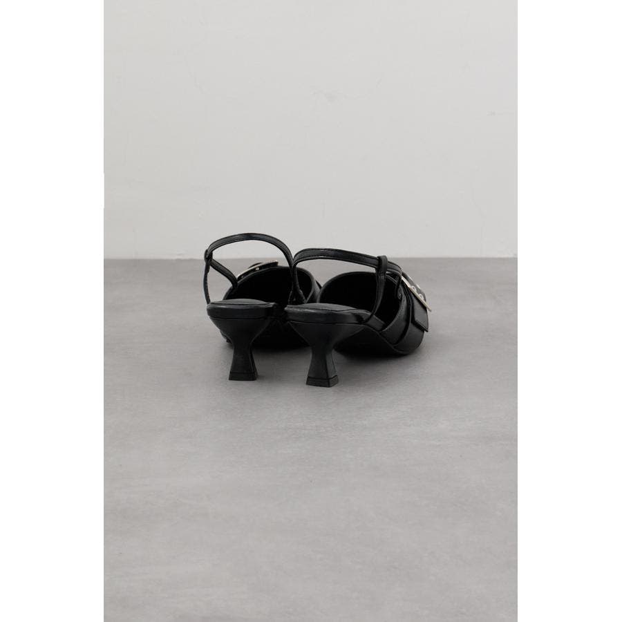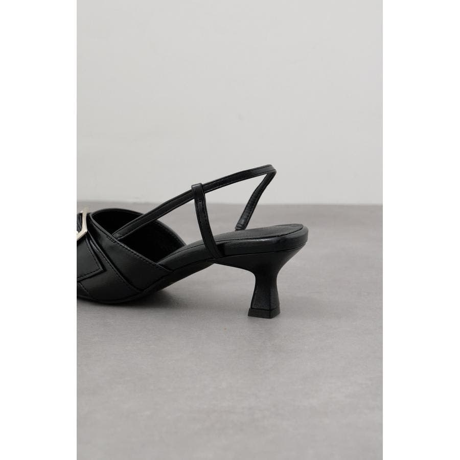 斜めにデザインされた太めのベルトが足元にアクセントを加え、シンプルながらも洗練された印象を与えます。