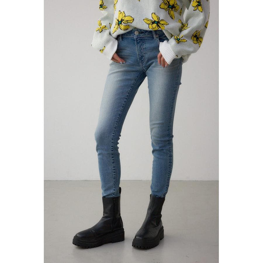 濃淡の効いたUSED風の加工とヒゲ・太もものハイライトが、脚のラインを自然にカバーしながら立体感のある美脚シルエットに。