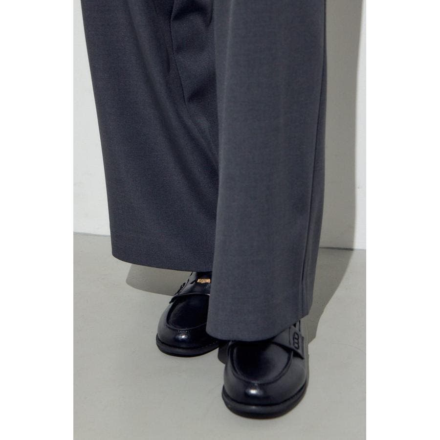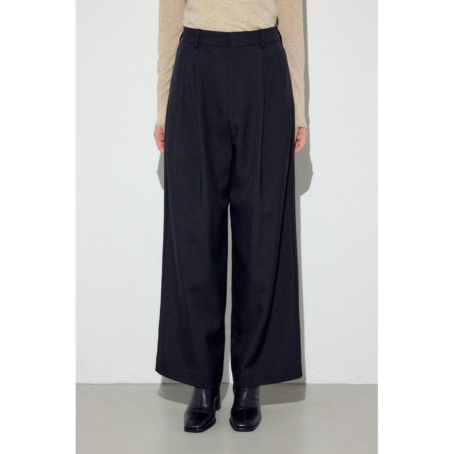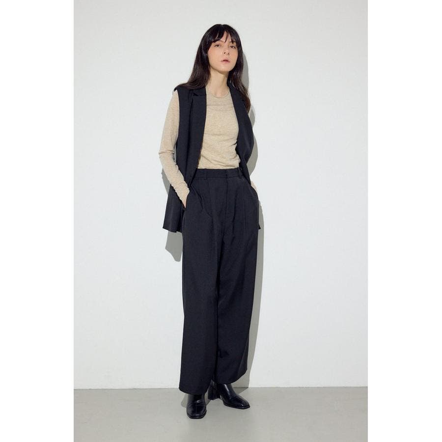 落ち感のきれいな素材で、脚のラインをまっすぐ長く見せるワイドシルエット。