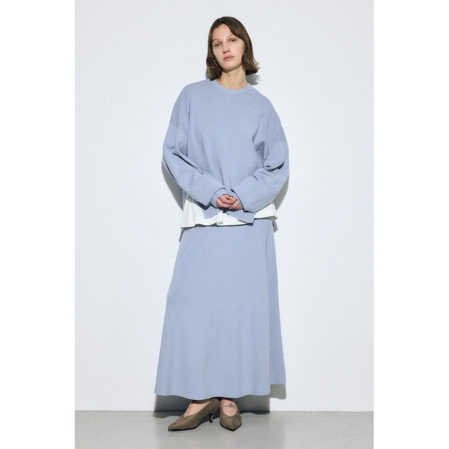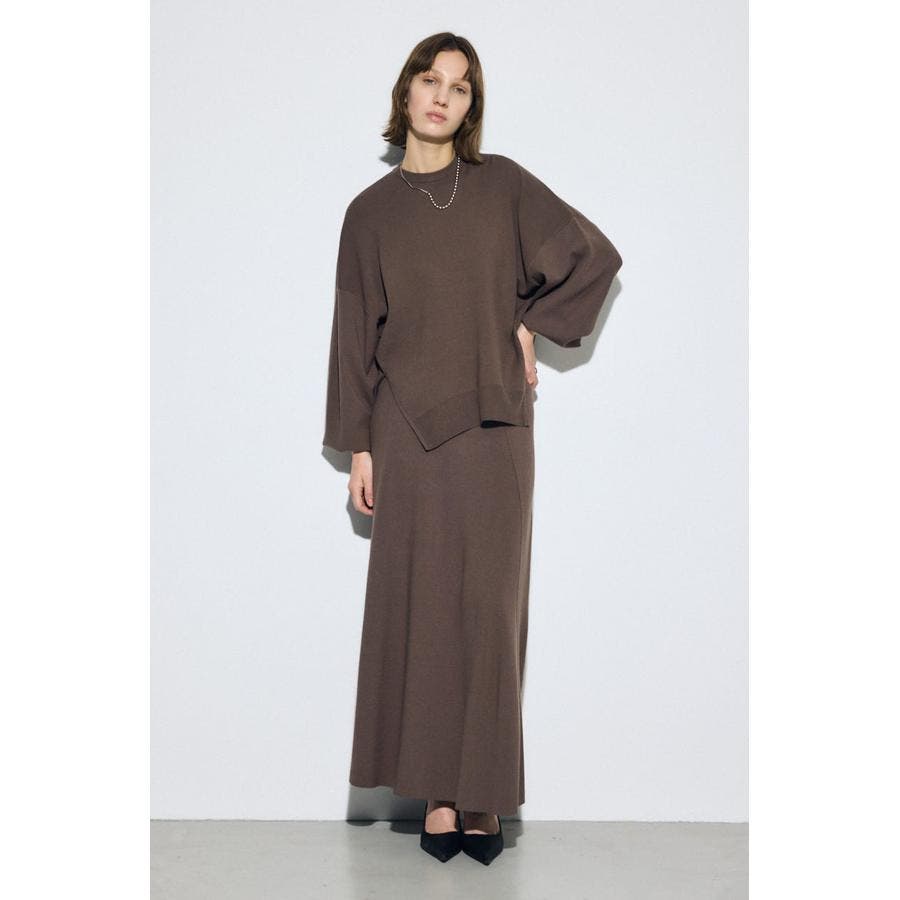 同素材のスカート(250JSB71-4921 フレアニットロングスカート)と合わせた統一感のあるきれいめセットアップスタイルがおすすめ。