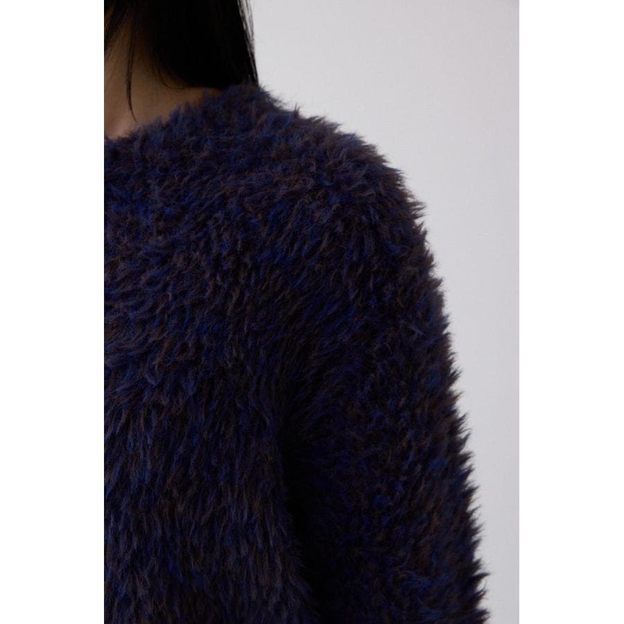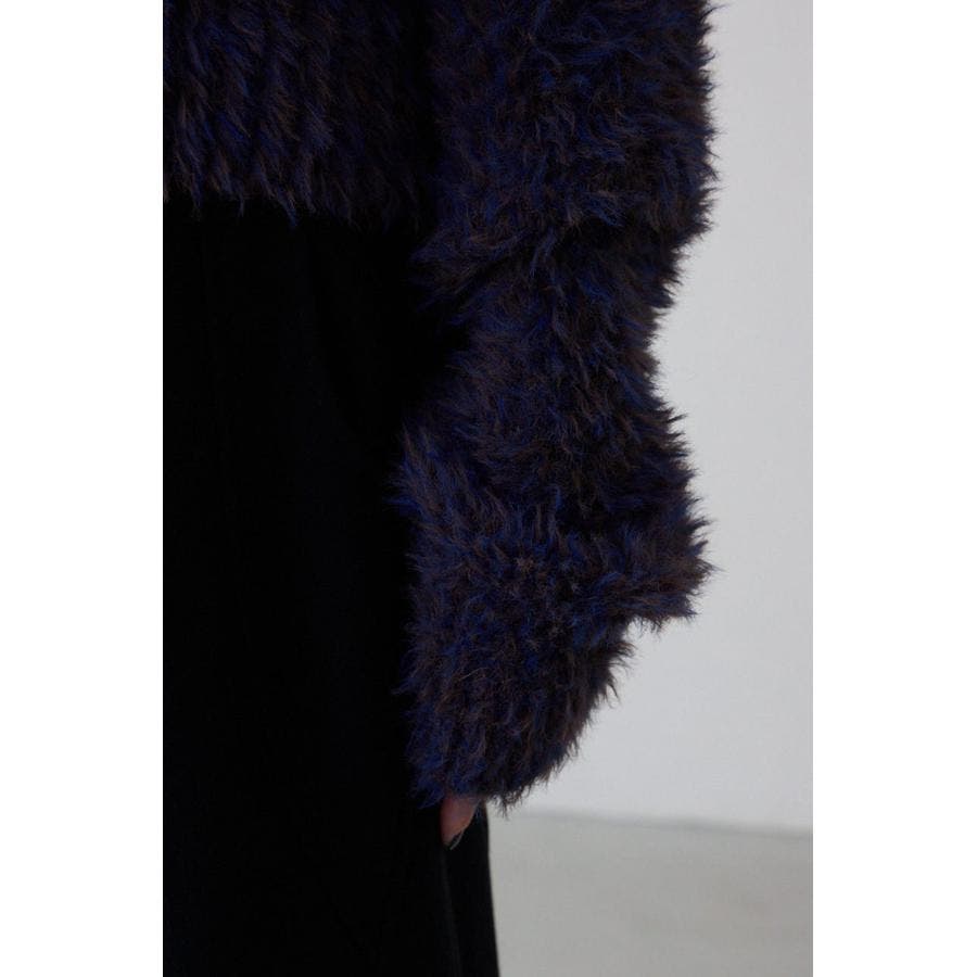 3色の毛足の長いシャギー糸を一緒に編みたてる事で表面化をだしています。