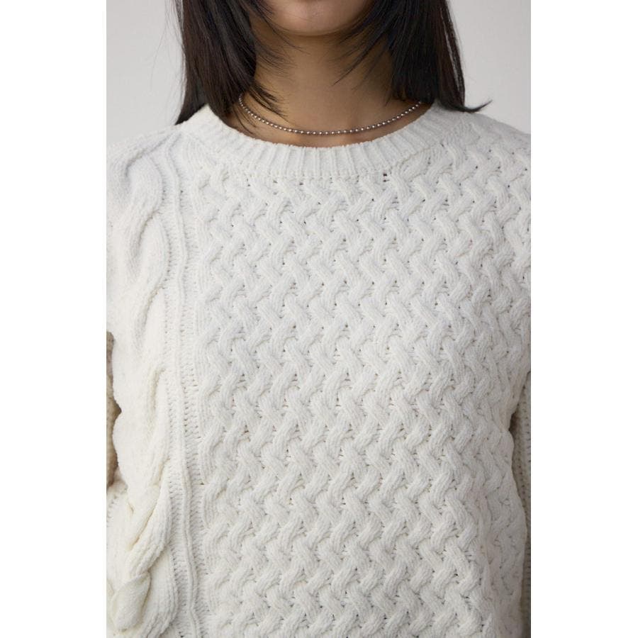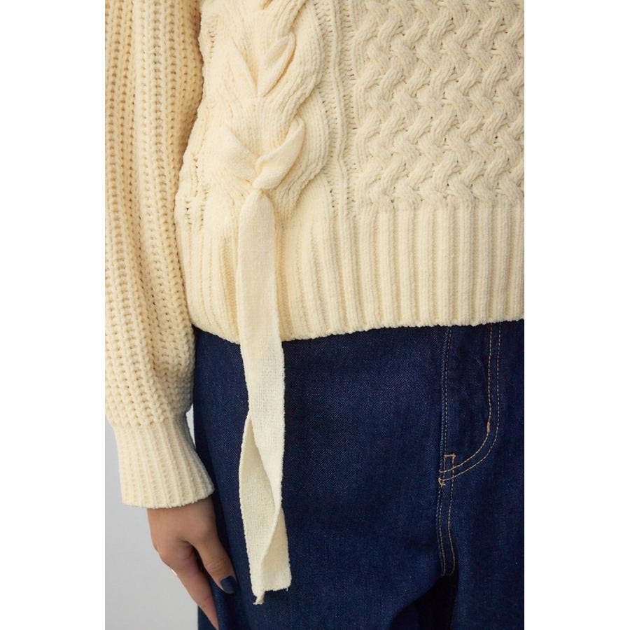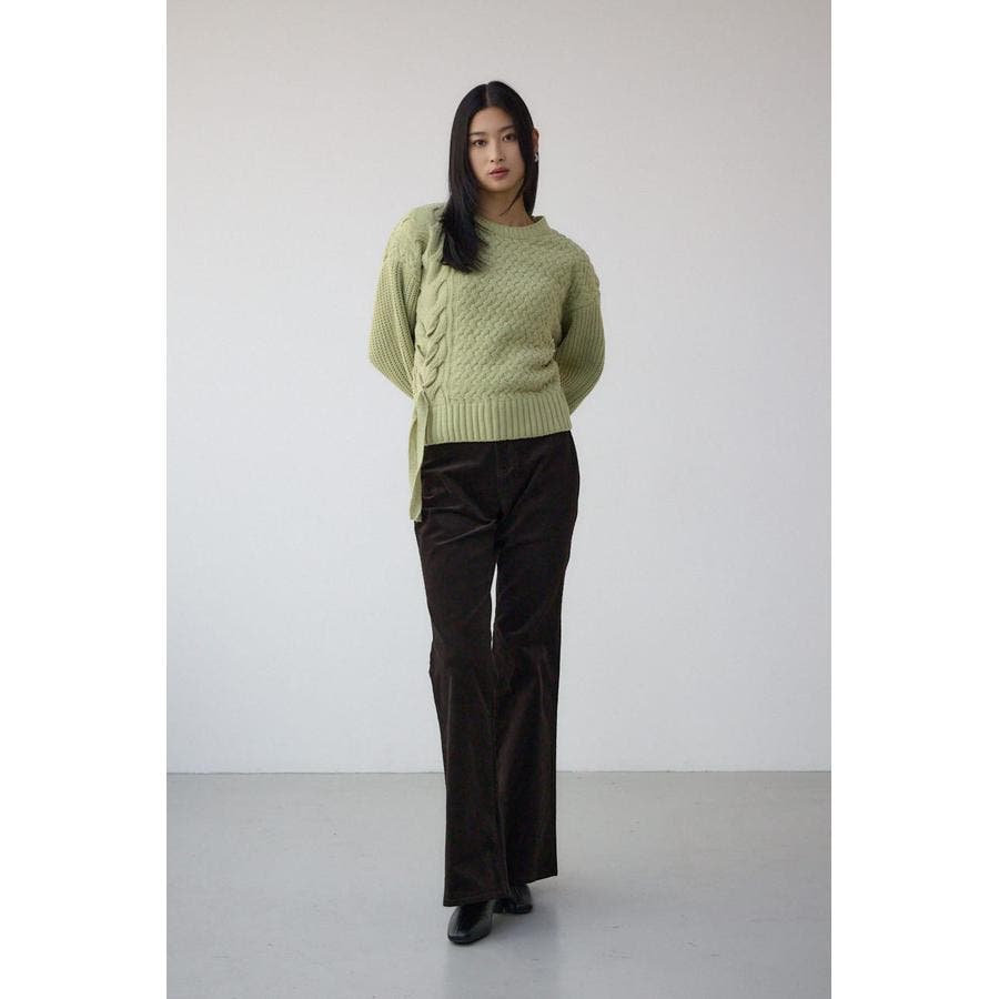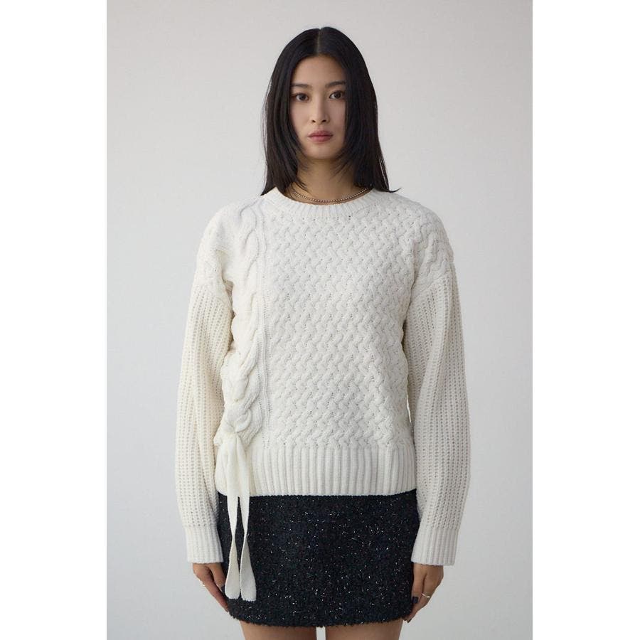 目を惹くレースアップデザインと編地切り替えがポイントのニットトップスです。