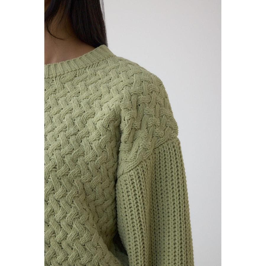 光沢の少ないポリエステルモール糸を度目を詰めて、色々な編み柄を組み合わせて編み立てています。
