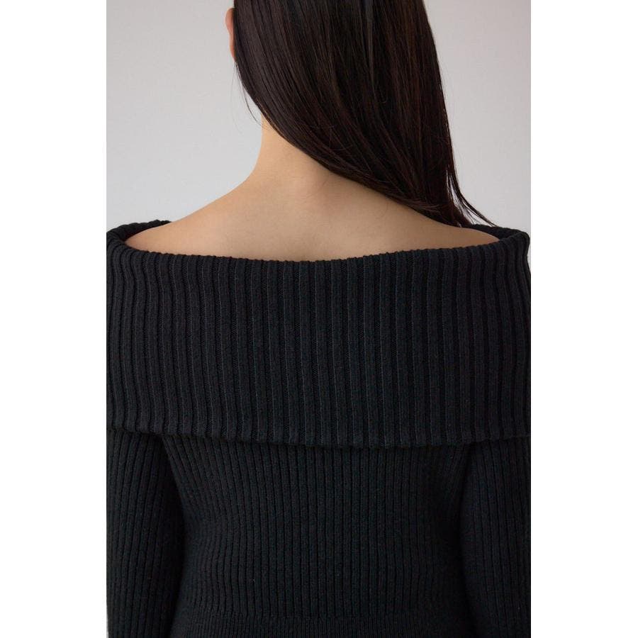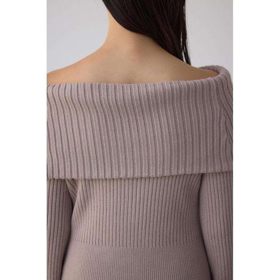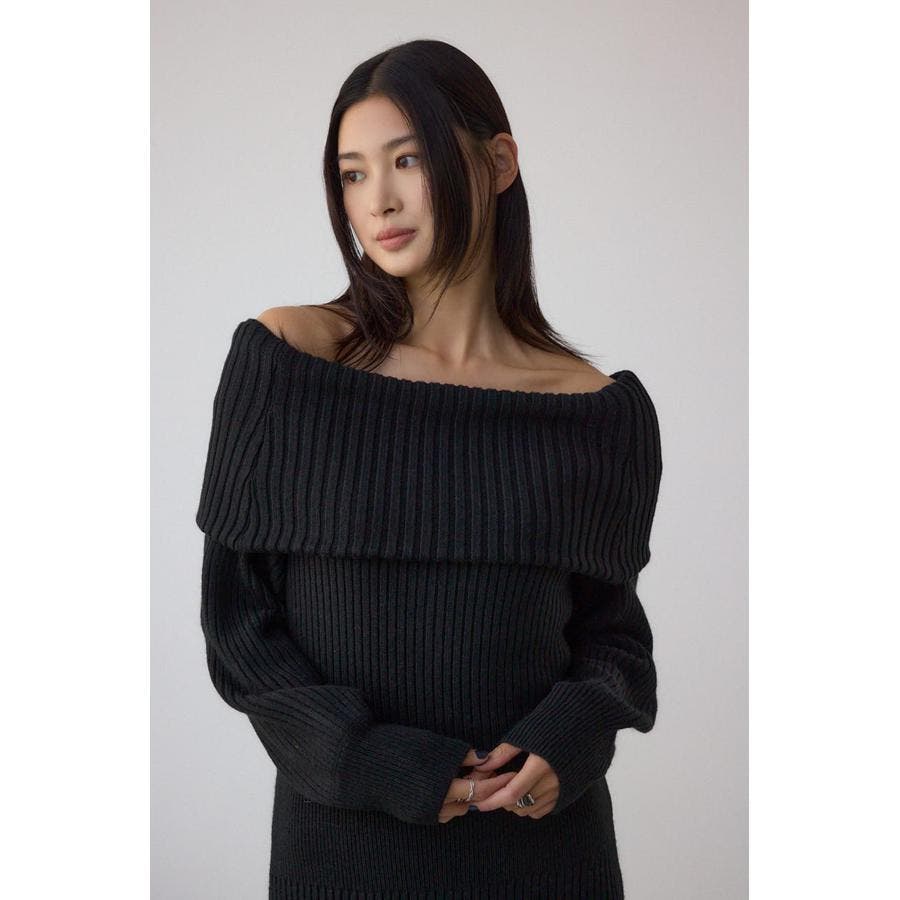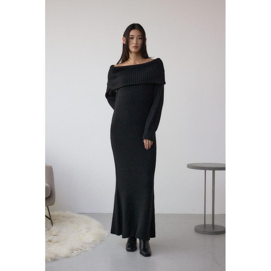 デコルテラインを美しく見せる、大胆なオフショルダーデザイン。