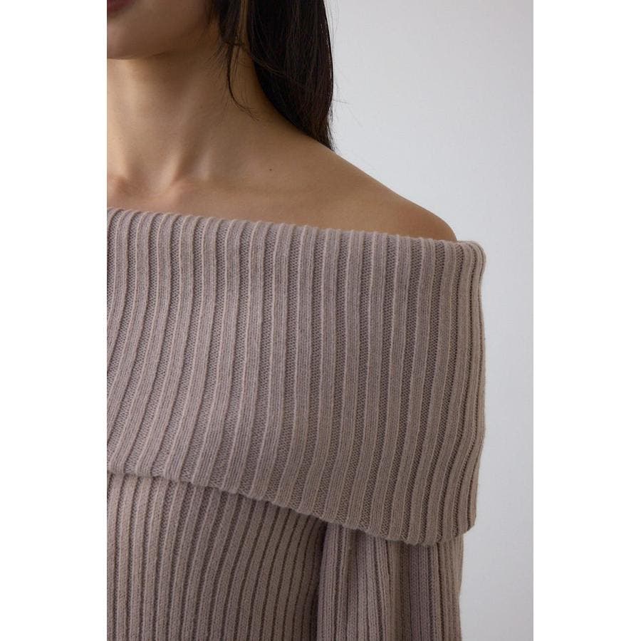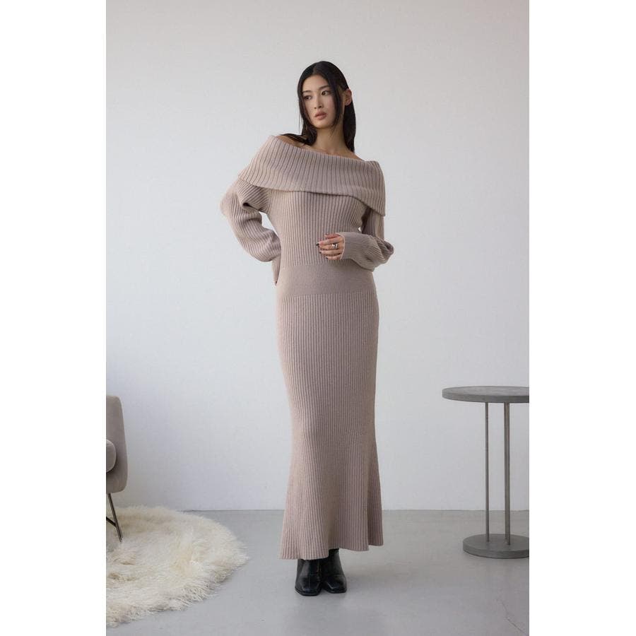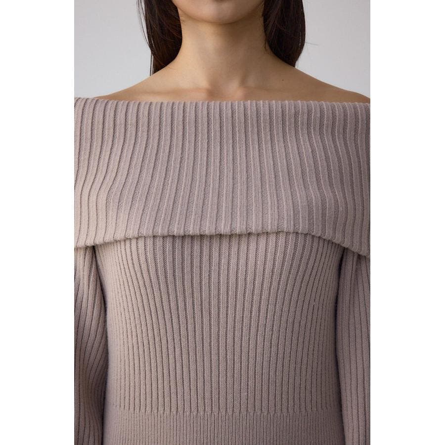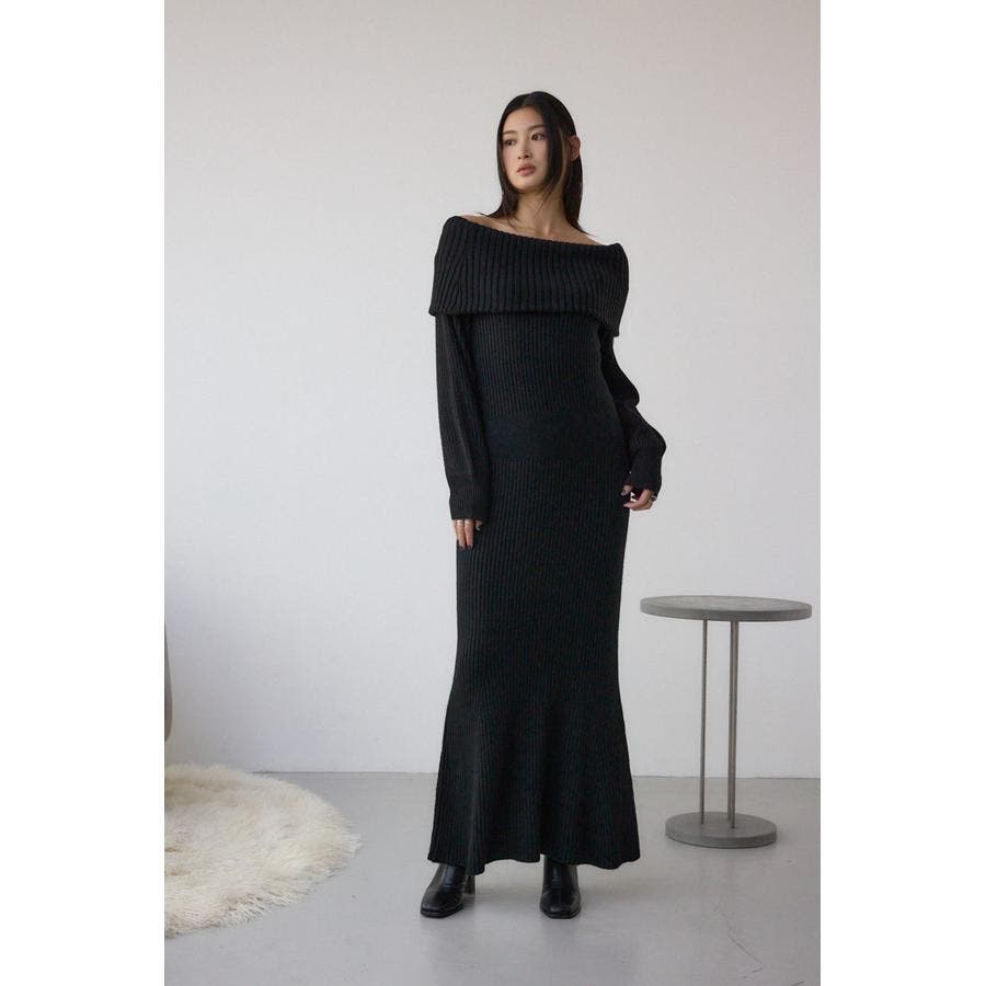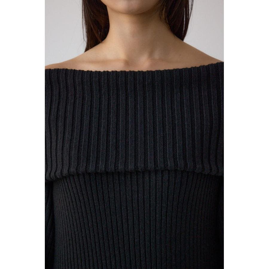 デコルテラインを美しく見せる、大胆なオフショルダーデザイン。