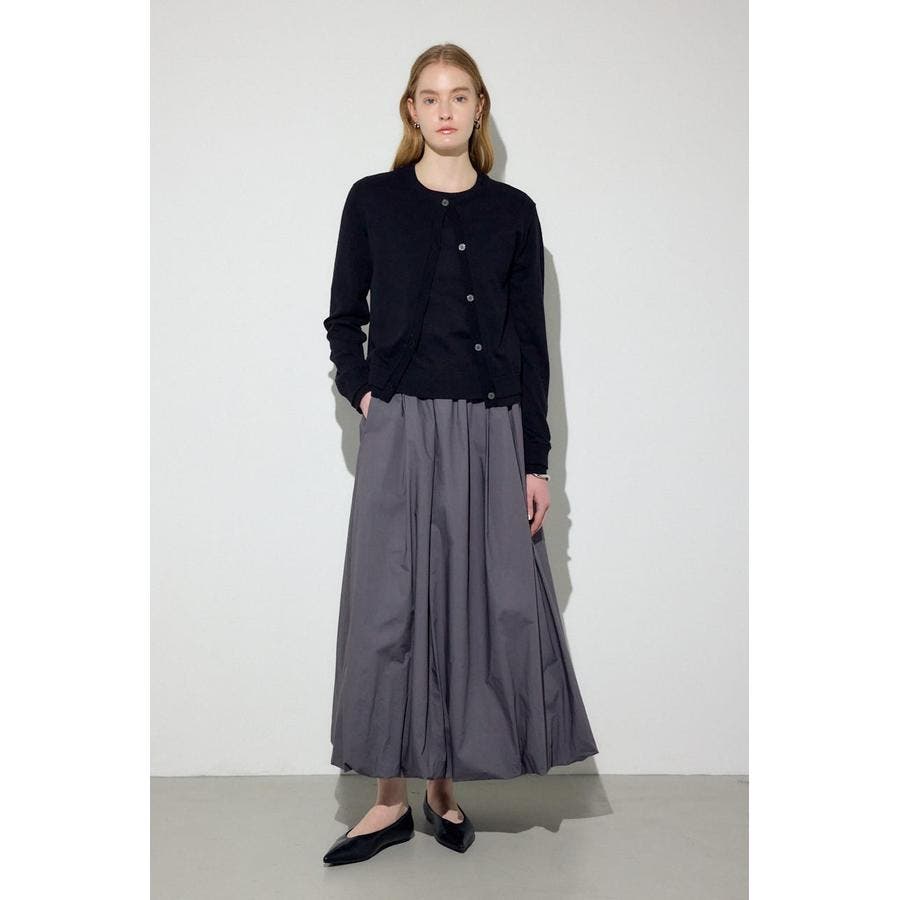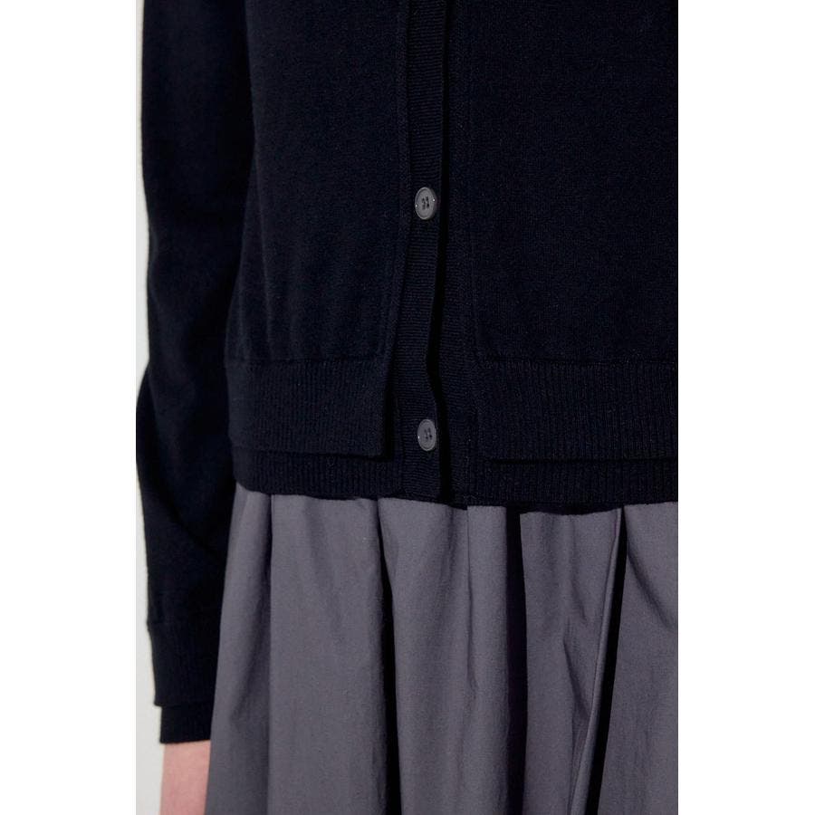 カシミヤ混素材の上品な風合いに、袖口と裾のフェイクレイヤードディテールがアクセントになったクルーネックカーディガン。