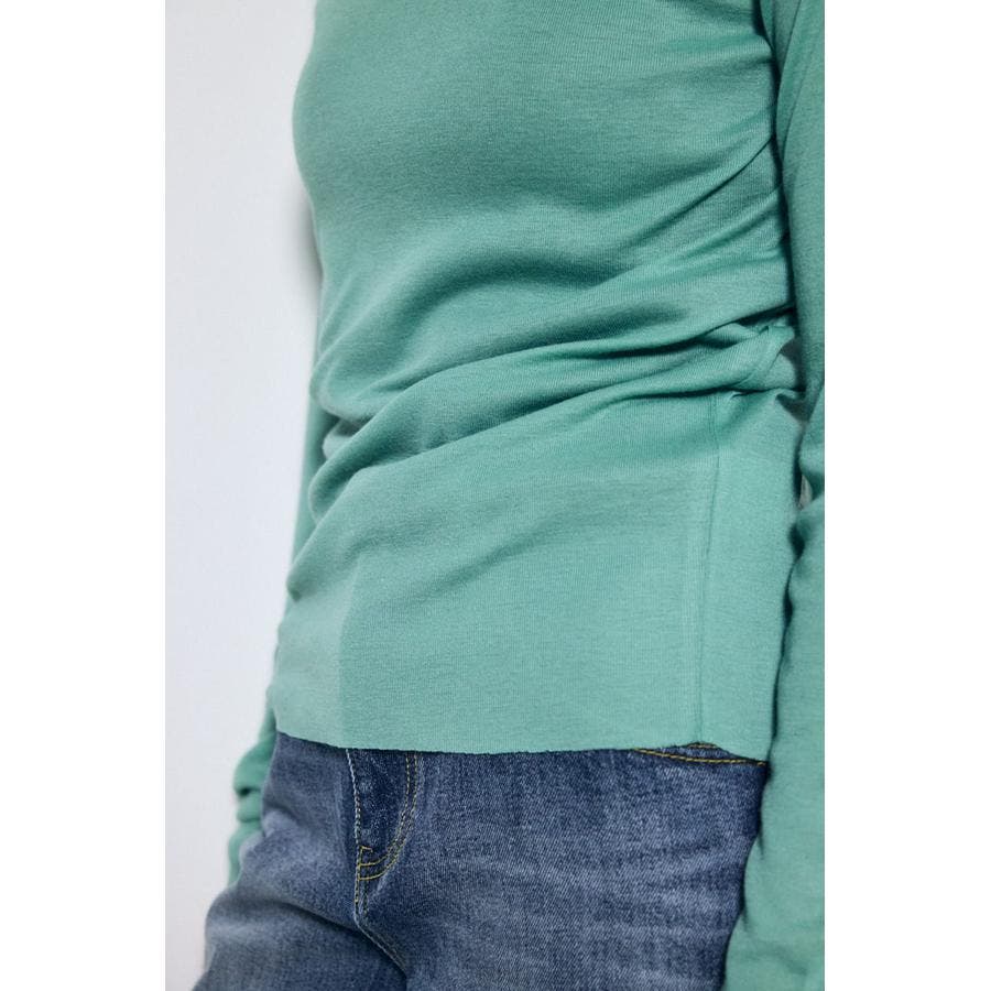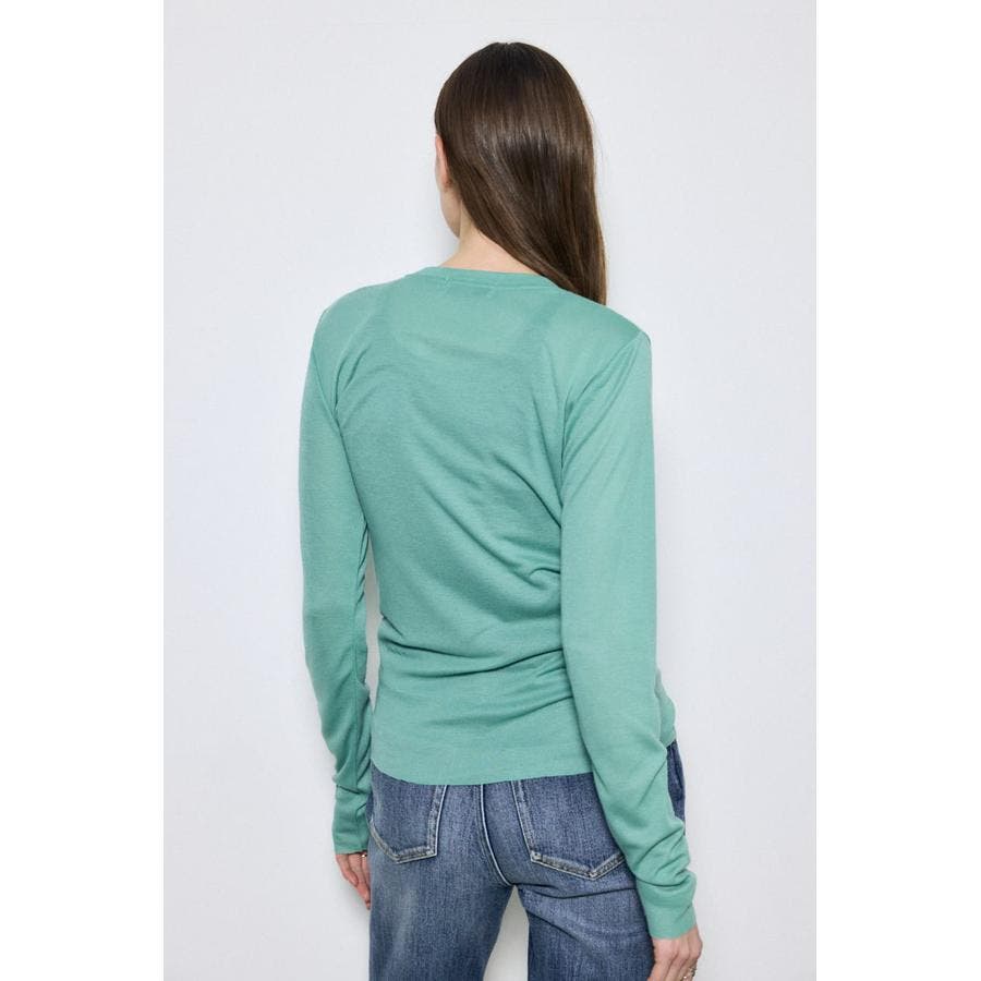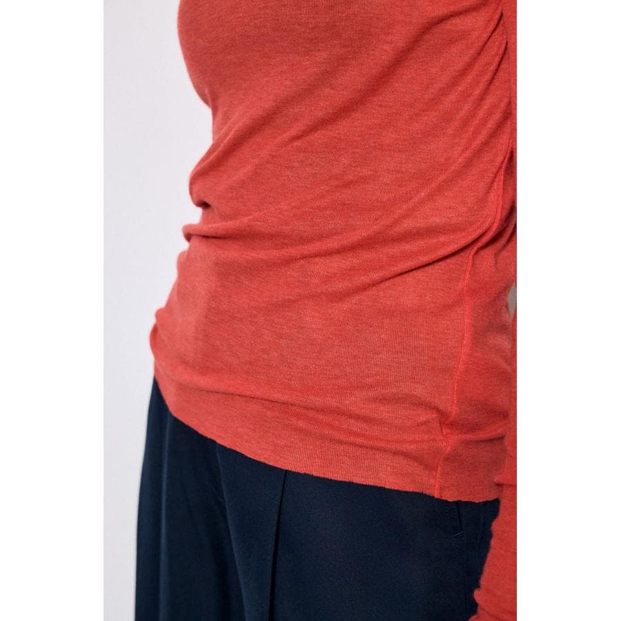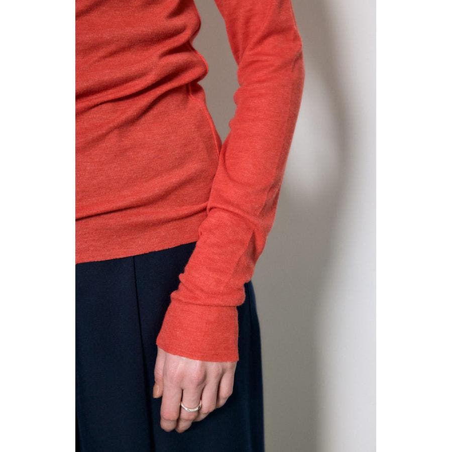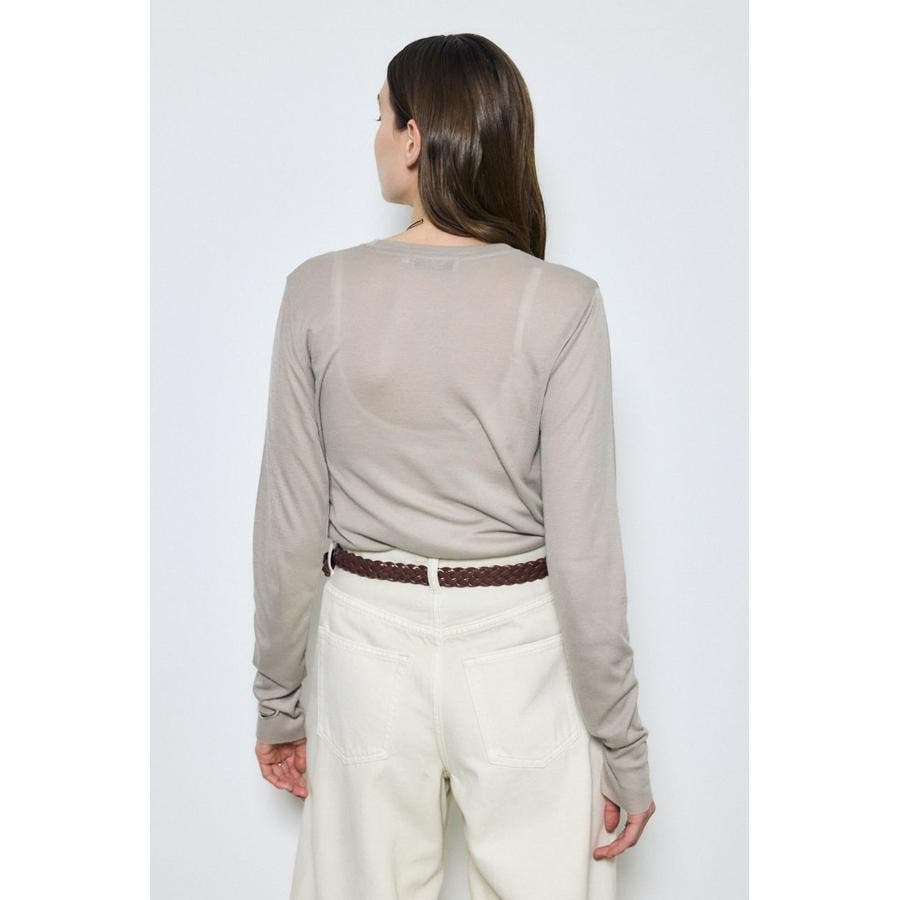 ベーシックなクルーネック仕様で、レイヤードしやすいデザイン。