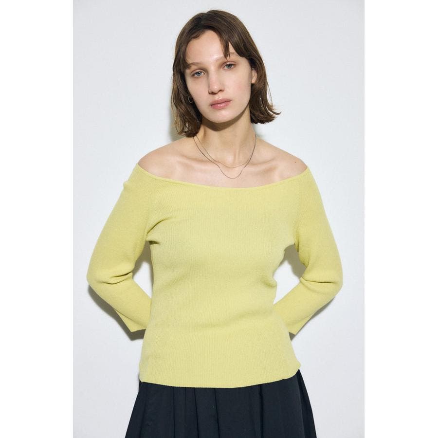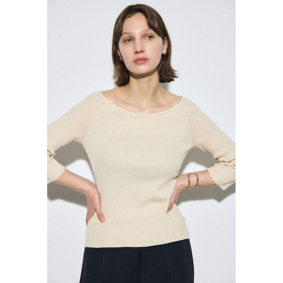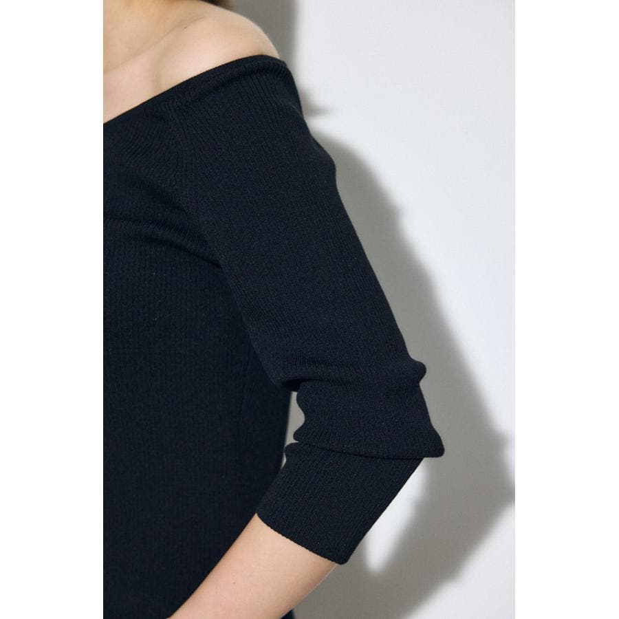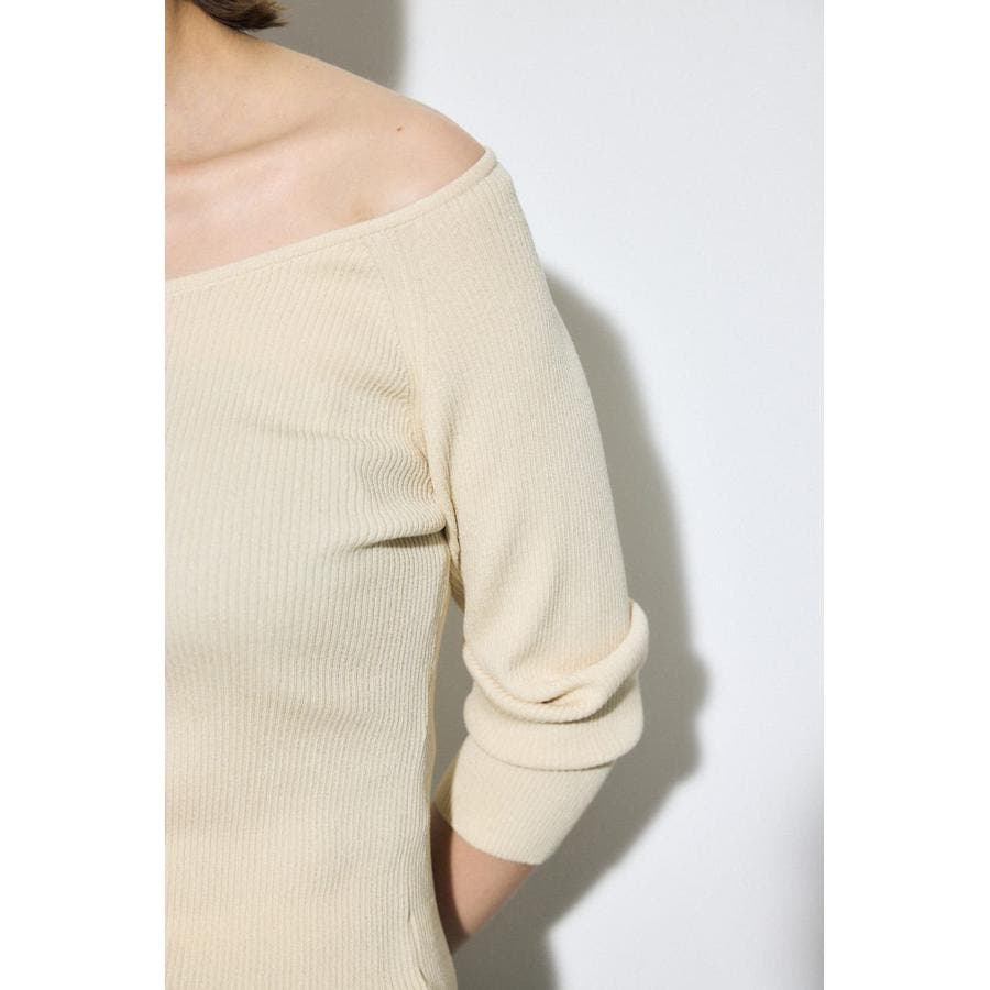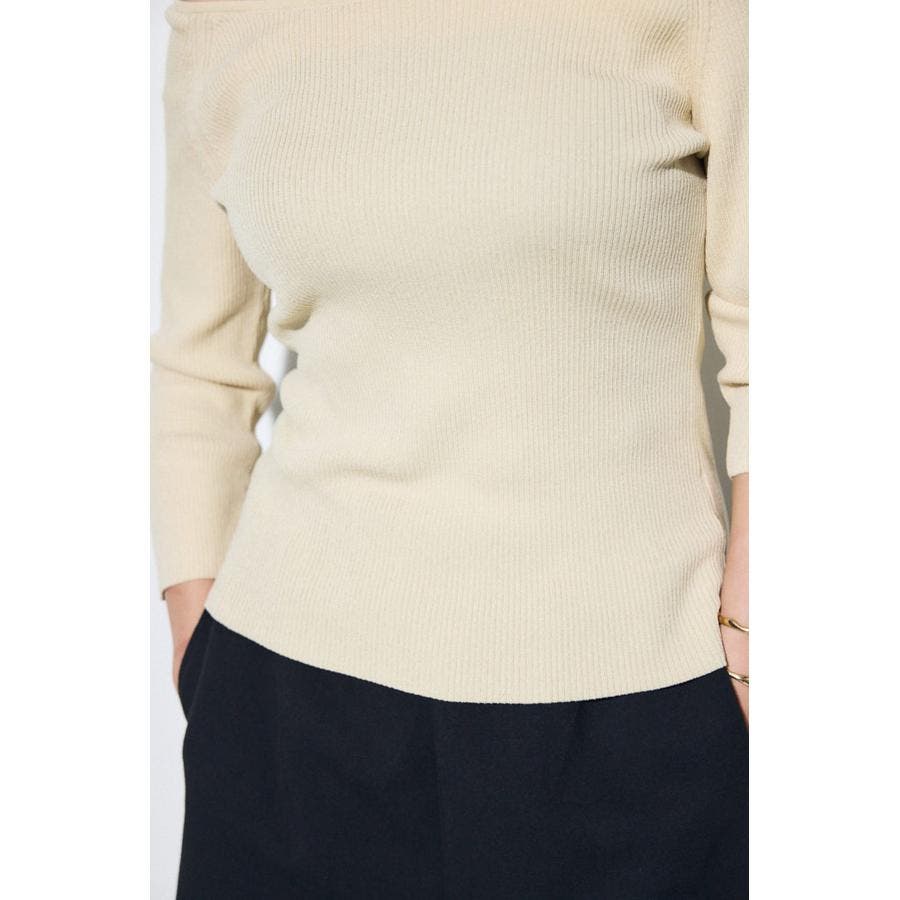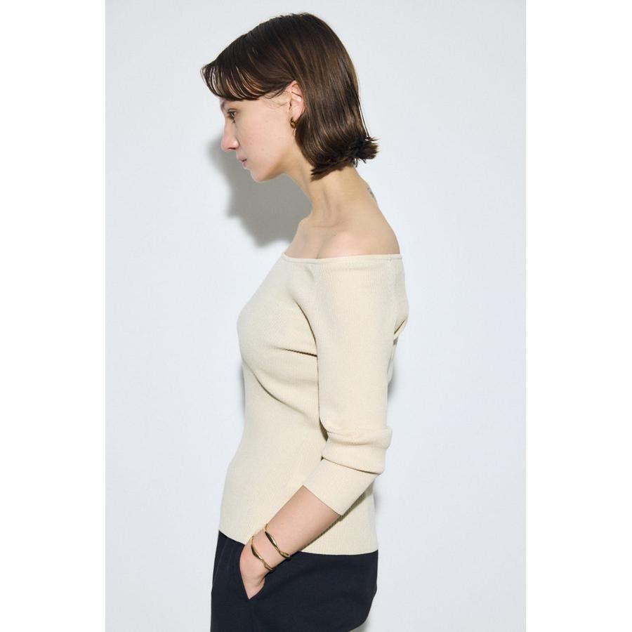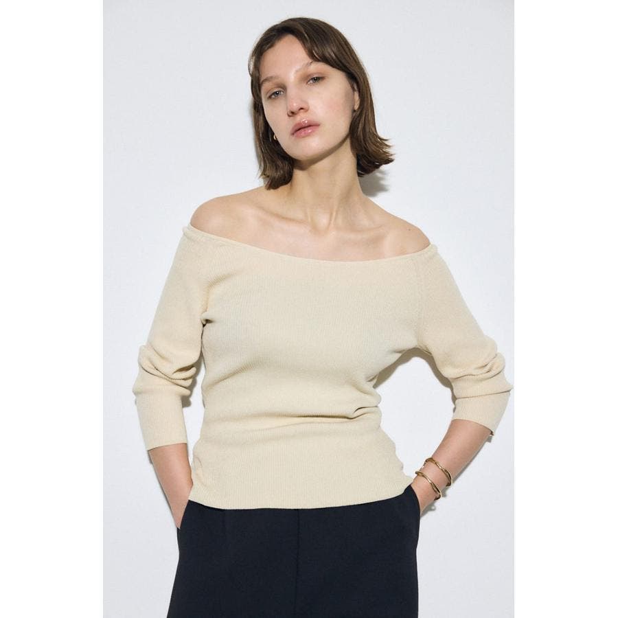 デコルテをきれいに見せてくれる、オフショルダーニットトップス。