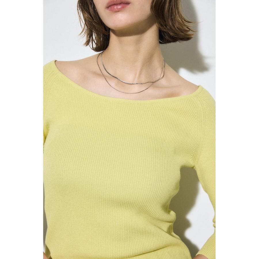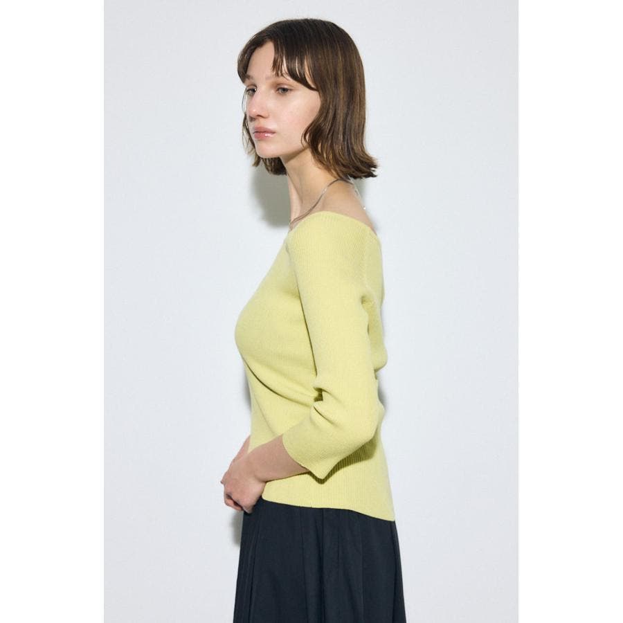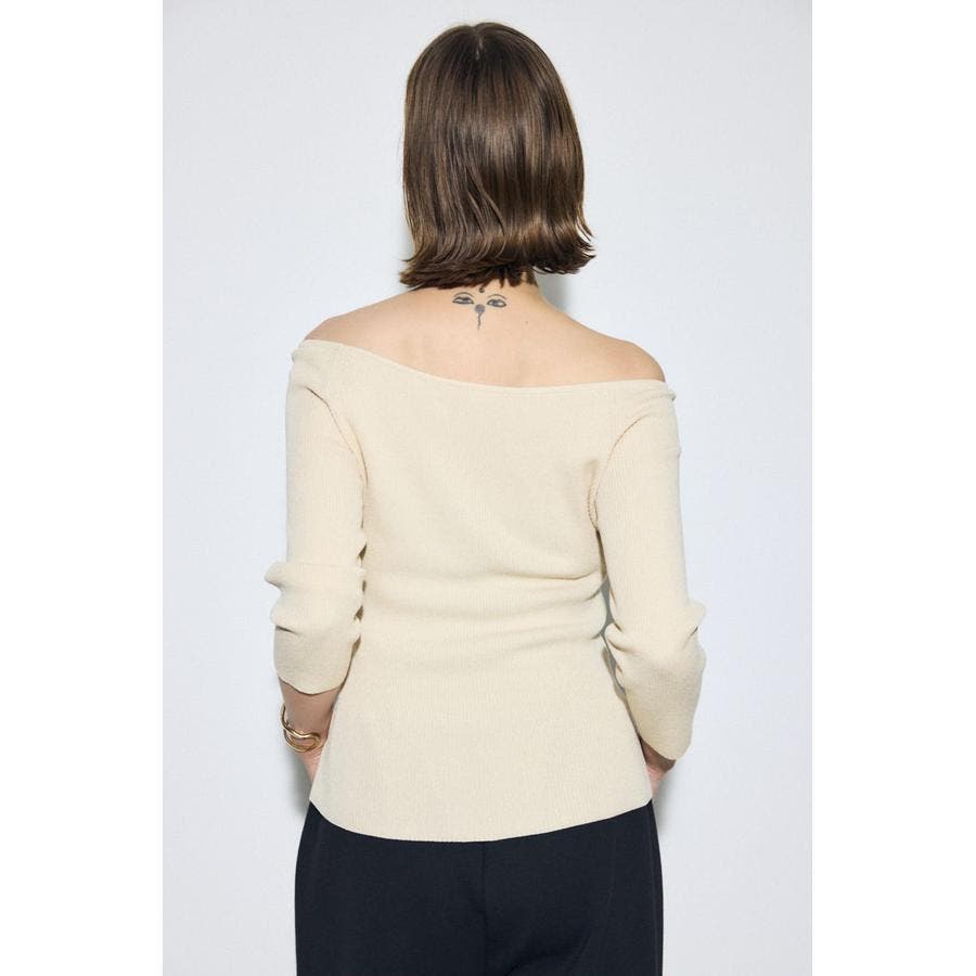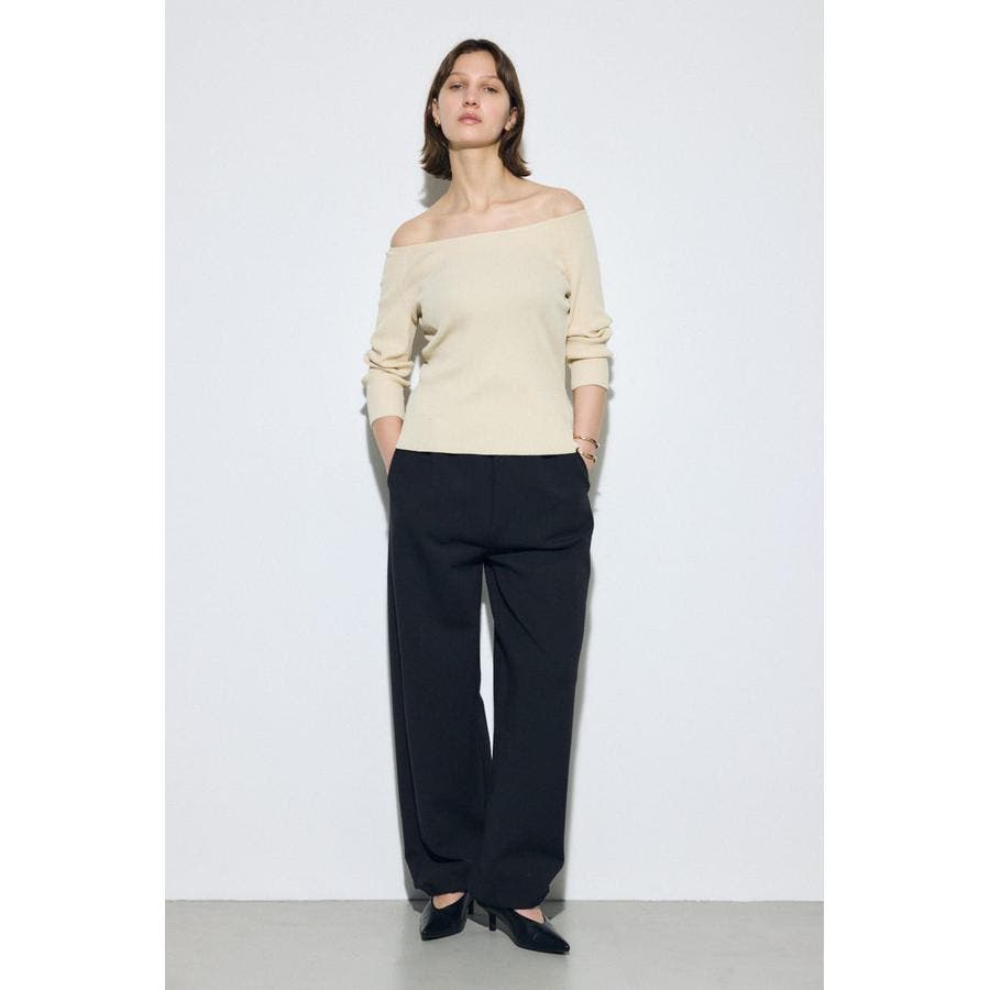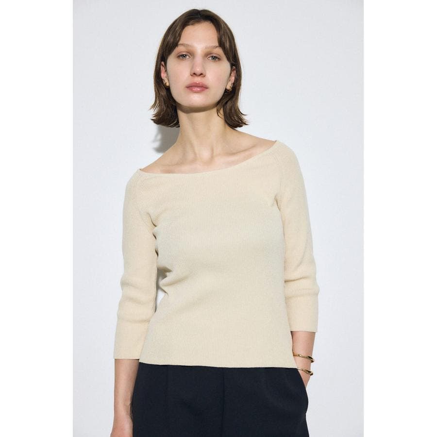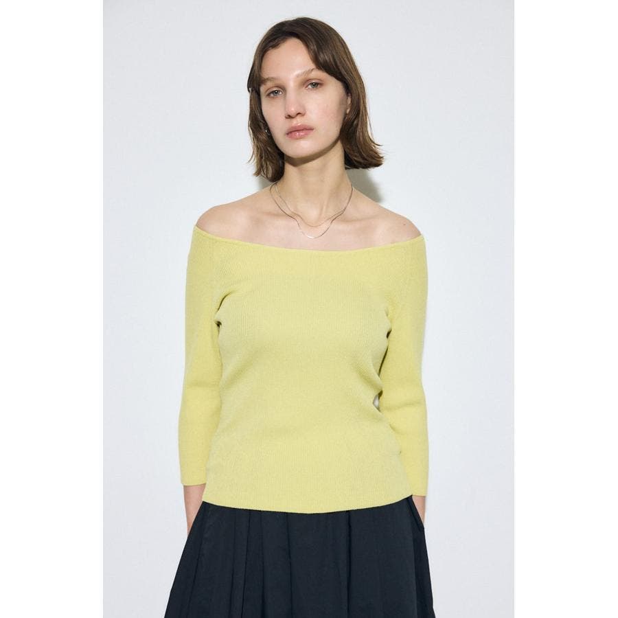 デコルテをきれいに見せてくれる、オフショルダーニットトップス。