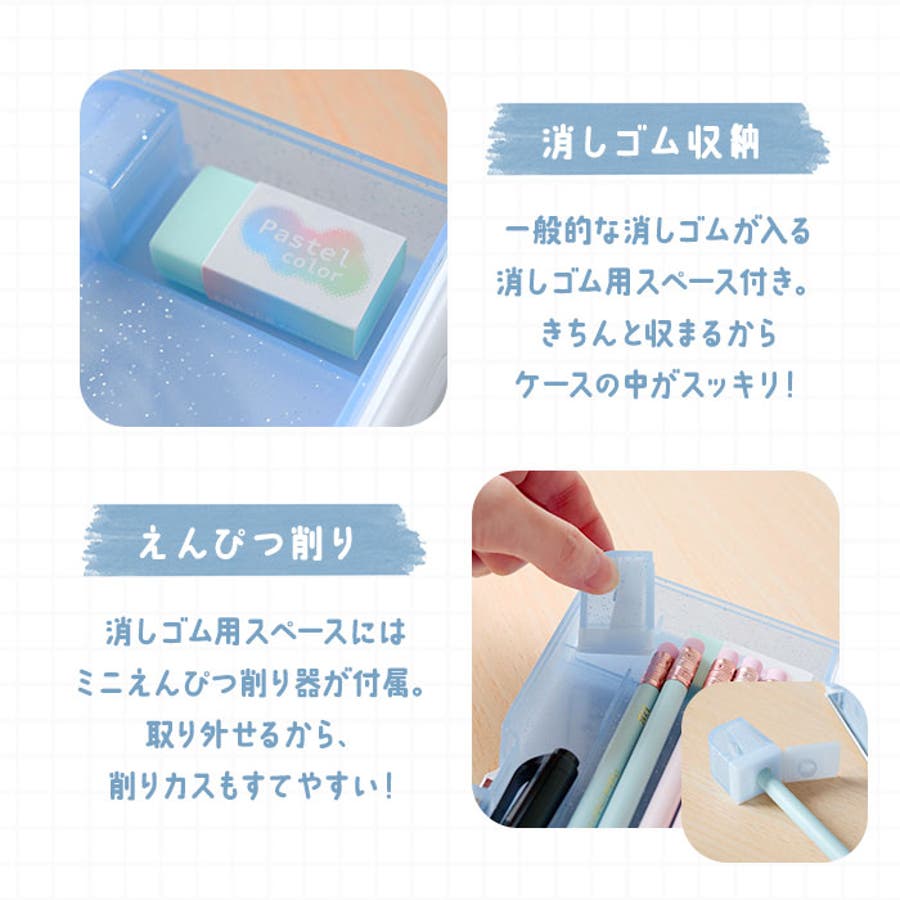 ・消しゴム用スペースの隣にはミニ鉛筆削り器が付属。取り外せるから、削りカスを捨てるときも簡単便利♪