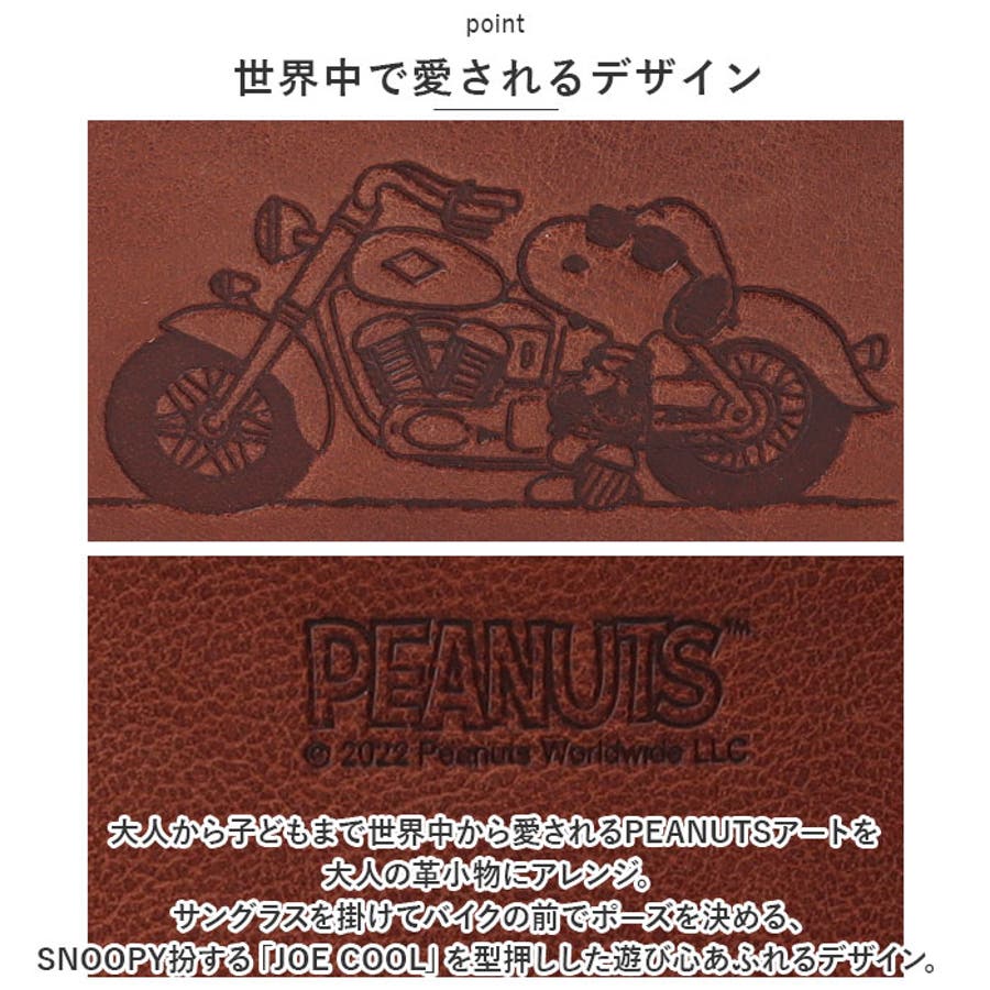 ・世界中から愛されるPEANUTSアートを大人の革小物にアレンジ。サングラスを掛けてバイクの前でポーズを決める、SNOOPY扮する「JOE COOL」を型押しした遊び心あふれるデザイン。