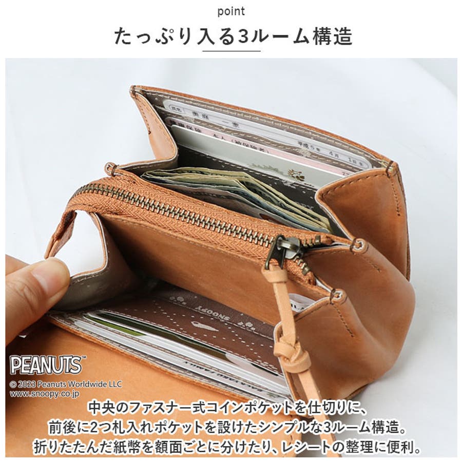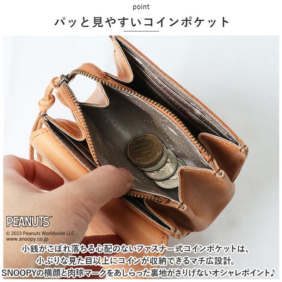 ・小銭がこぼれ落ちる心配のないファスナー式コインポケットは、小ぶりな見た目以上にコインが収納できるマチ広設計。SNOOPYの横顔と肉球マークをあしらった裏地がさりげないオシャレポイント♪