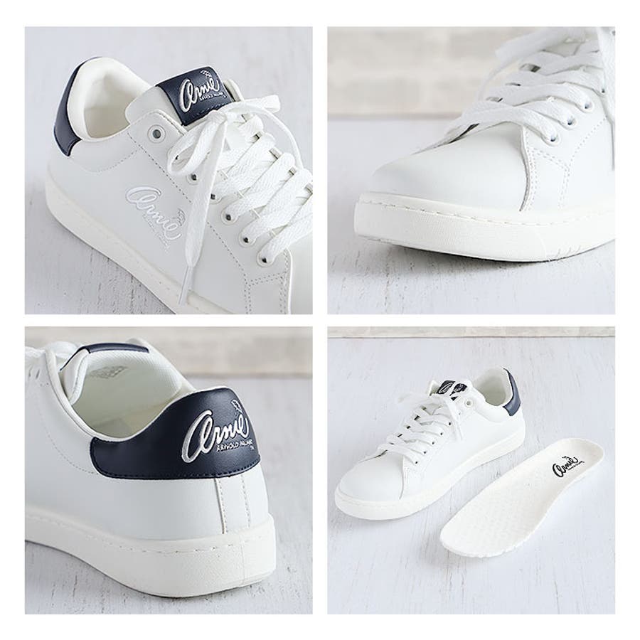 ・シュータンやアッパー外側に配置された、ぷっくりと立体的にプリントされた「Arnie」のシルバーロゴとパラソルマークがパッと目を惹くアクセント。