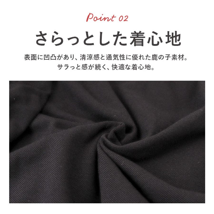 ・表面に凹凸があり、清涼感と通気性に優れた鹿の子素材。サラっと感が続く、快適な着心地。