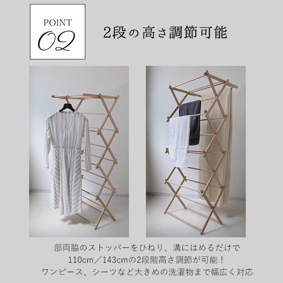 ・上部両脇のストッパーをひねり、溝にはめるだけで110cm/143cmの2段階高さ調節が可能!丈の長いワンピース、シーツなど大きめの洗濯物まで幅広く対応。