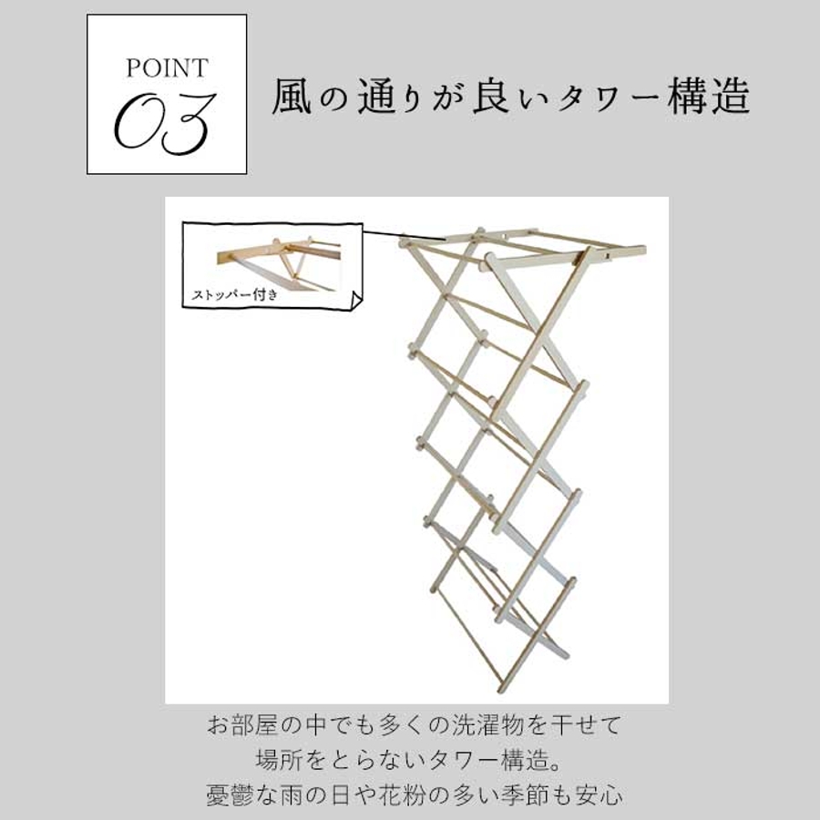 ・お部屋の中でも多くの洗濯物を干せて、場所をとらないタワー構造。憂鬱な雨の日や花粉の多い季節も安心。
