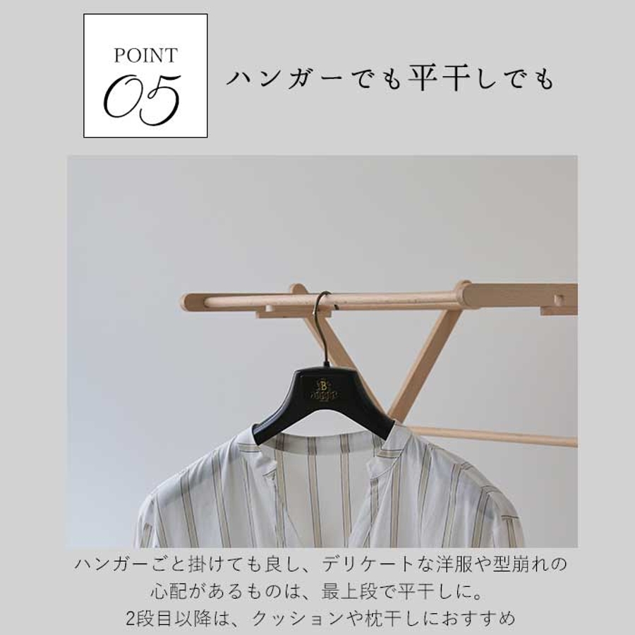 ・ハンガーごと掛けても良し、デリケートな洋服や型崩れの心配があるものは、最上段で平干しに。2段目以降は、クッションや枕干しにおすすめ。(※耐荷重3kg)