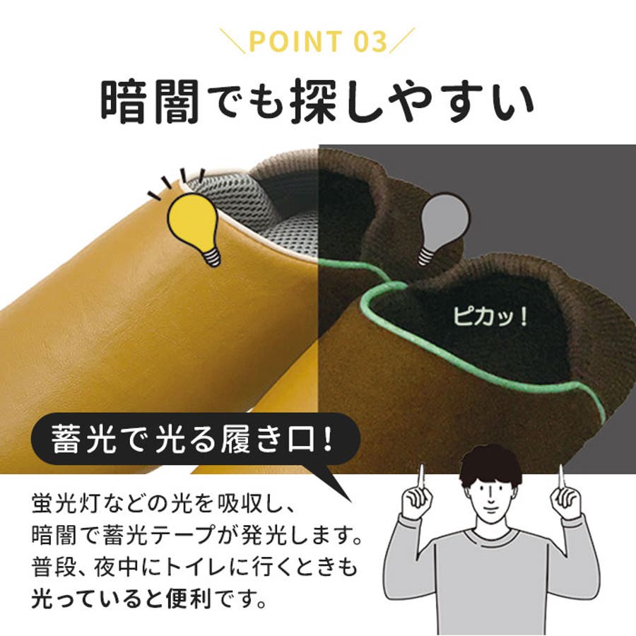 ・履き口には蛍光灯などの光を吸収し暗闇で光る蓄光テープを使用。暗闇でも探しやすく、普段使いでは夜中にトイレに行く時などにも便利。