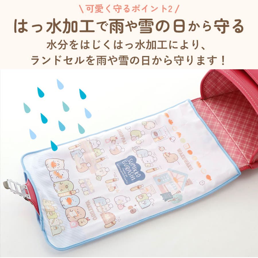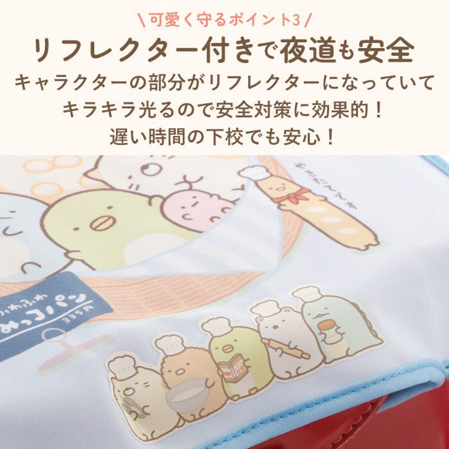 ・ランドセルカバー両面に、すみっコのキャラクターたちの反射シール付き。薄暗い雨の日の登校や夕方の下校時もママパパ安心。