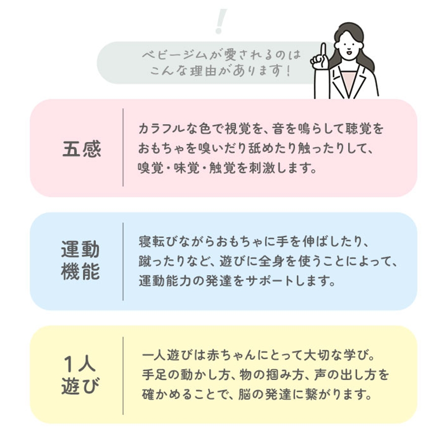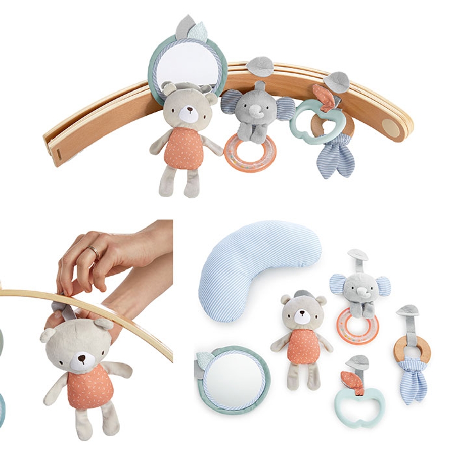 ・ぬいぐるみやビーズのラトルなど5種類のおもちゃが付属。トイバーに取り付けて遊んでも良し、取り外して単体遊びもOK。
