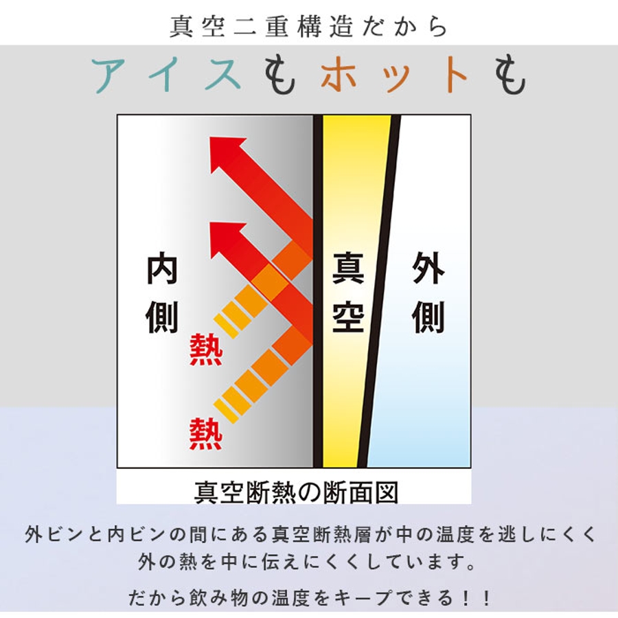 ・本体内側と外側が真空断熱されたステンレス二重構造タイプで、熱が伝わりにくいため、冷たいものも温かいものも、飲み頃温度を保ってくれる