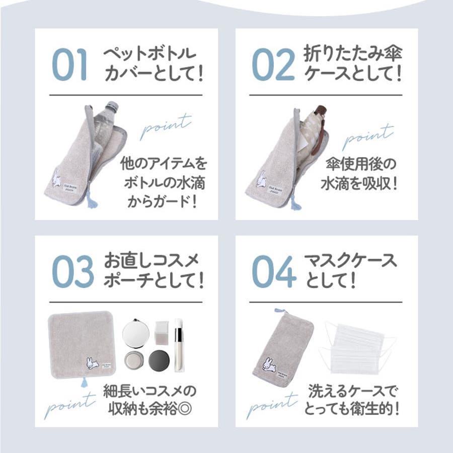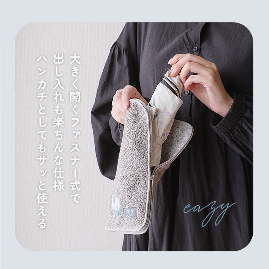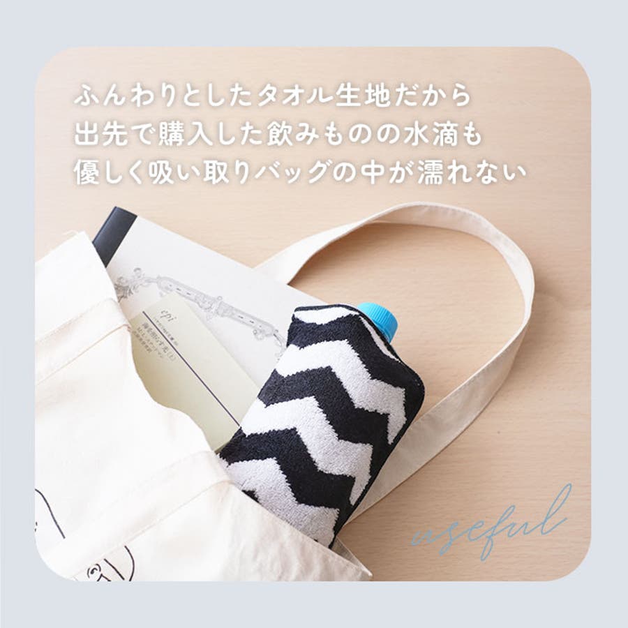 ・吸水性に優れたコットンパイル生地が、冷たいペットボトル、濡れた折りたたみ傘の水滴を吸い取って優しくカバー。