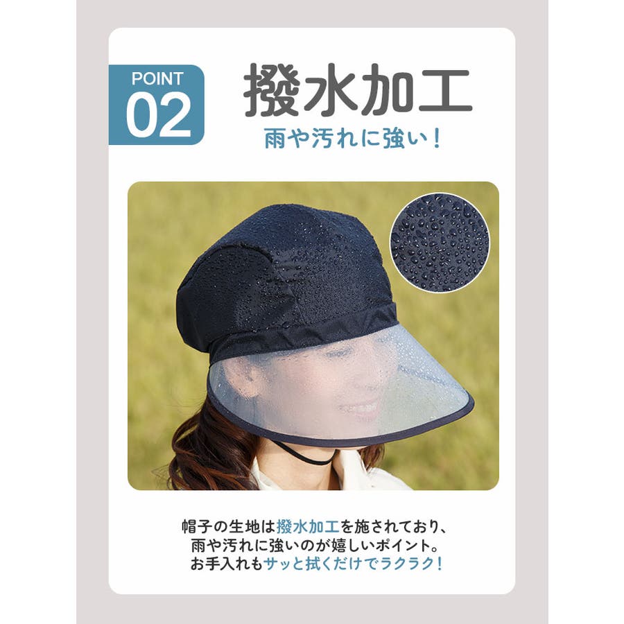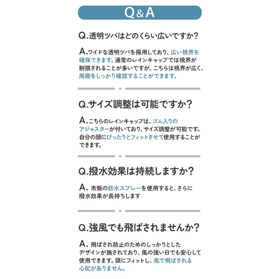 レインキャップ、キャスケット型の雨用帽子です。生地は撥水加工で雨に強く、ワイドなツバで雨から顔を守ります。ツバ部分は透明になっており、雨の日でも前が見やすく、飛ばされ防止の顎にかけられるゴム付き。後ろの部分にもゴムが入っておりずれにくくなっています。