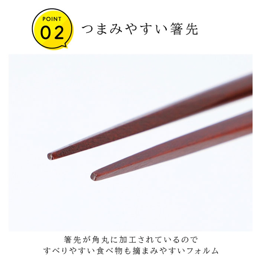 ・箸先が角丸に加工されているので、すべりやすい食べ物も摘まみやすいフォルム。