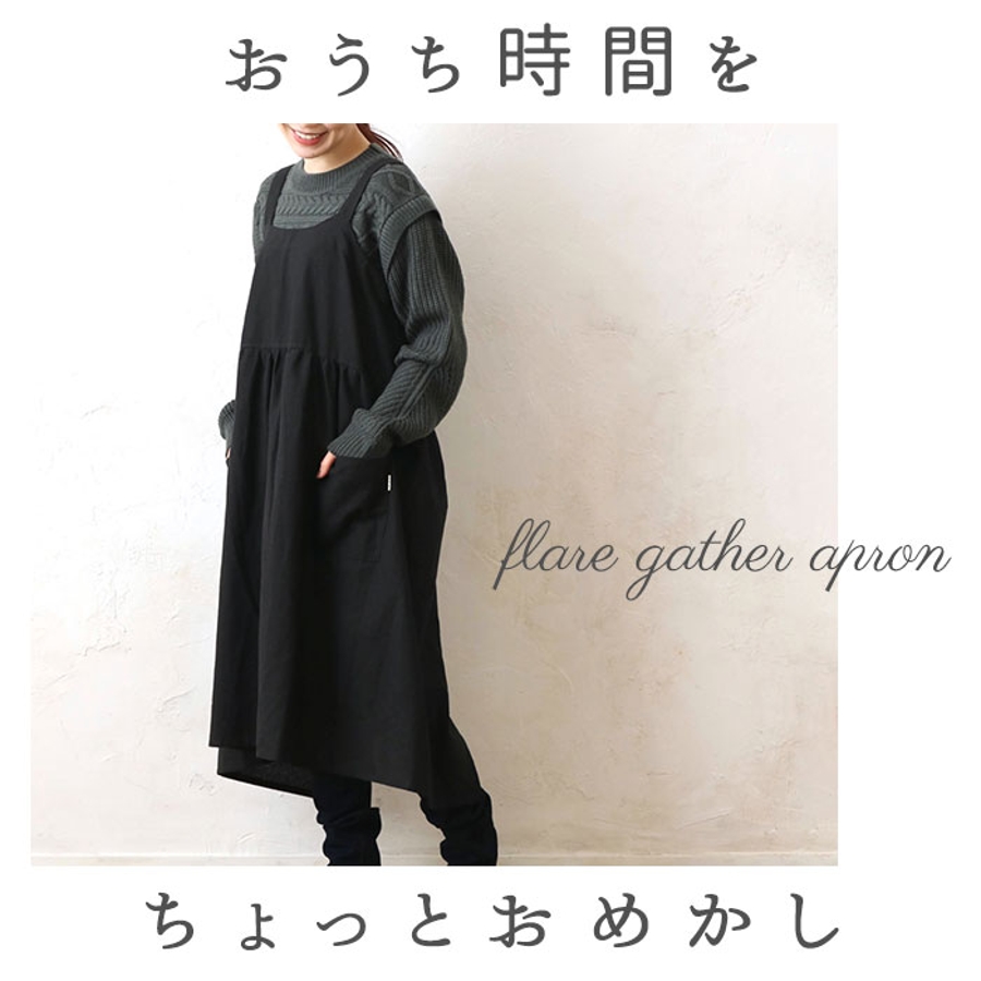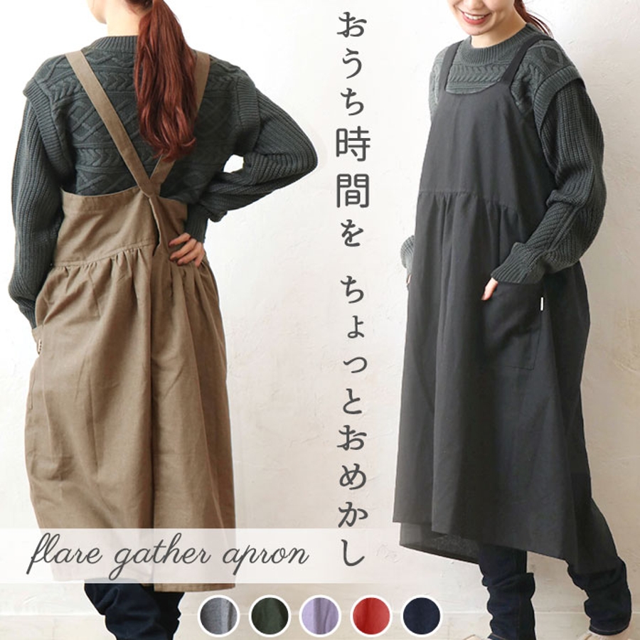 ・ウエストにギャザーが入って、ふんわりとしたフレアなシルエットがポイント☆エプロンに見えないワンピースのようなエプロン♪そのまま近所へお出かけもできちゃう◎