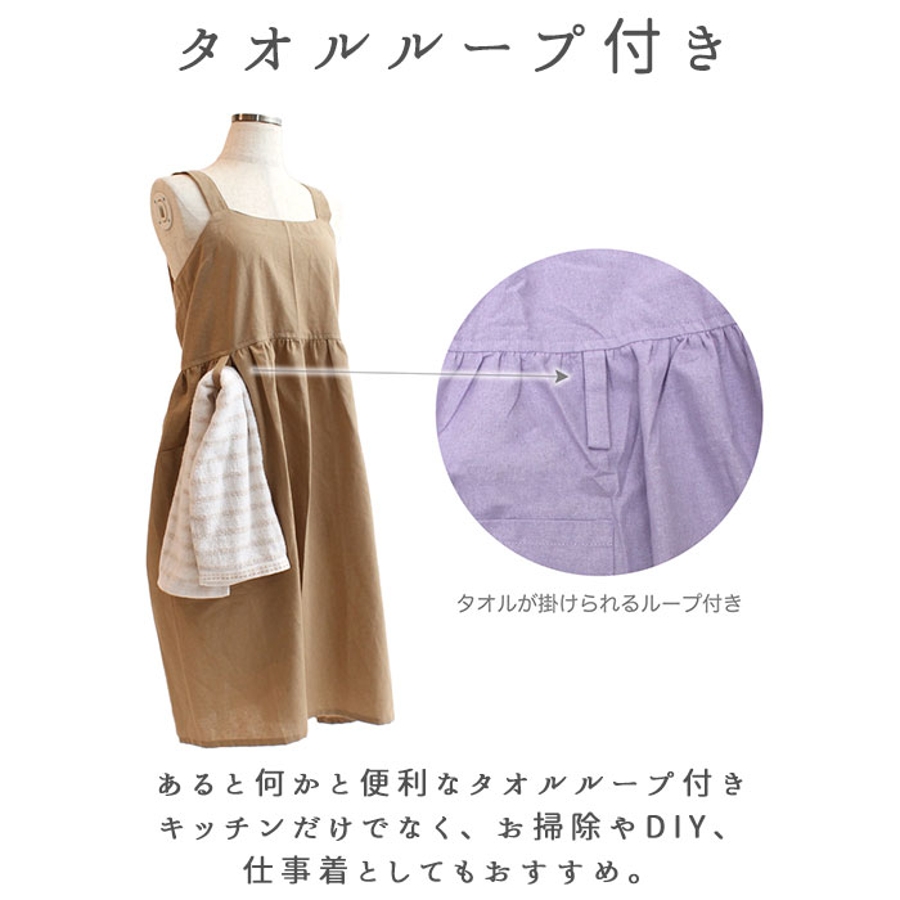・あると何かと便利なタオルループ付きで、キッチンだけでなく、お掃除やDIY、仕事着としてもおすすめ。